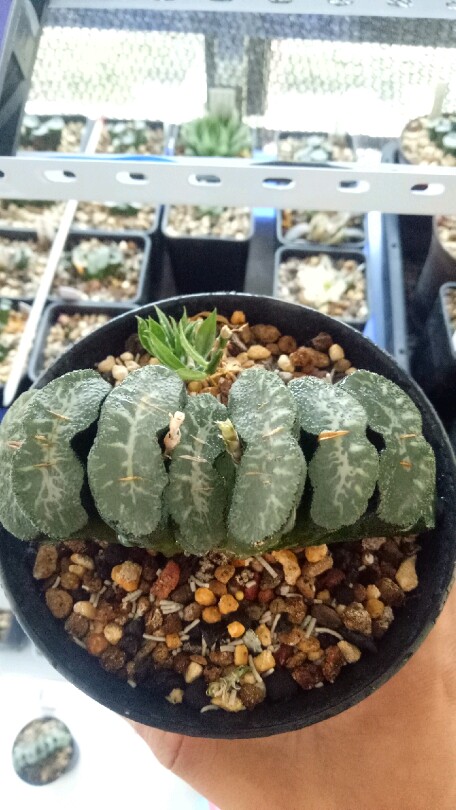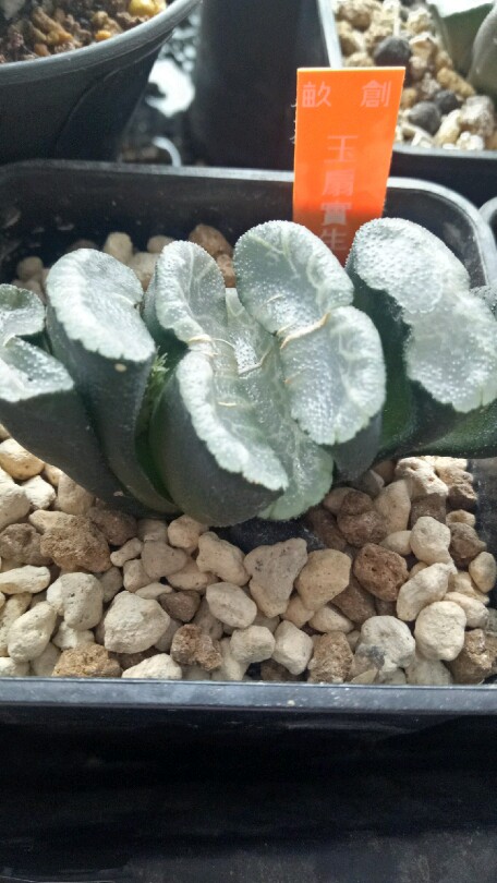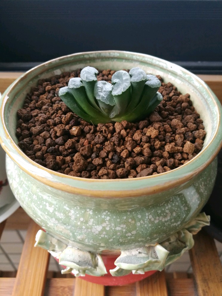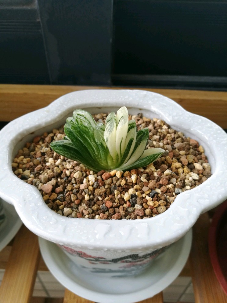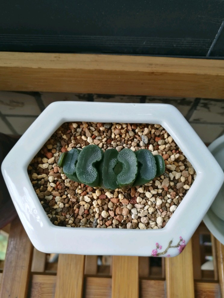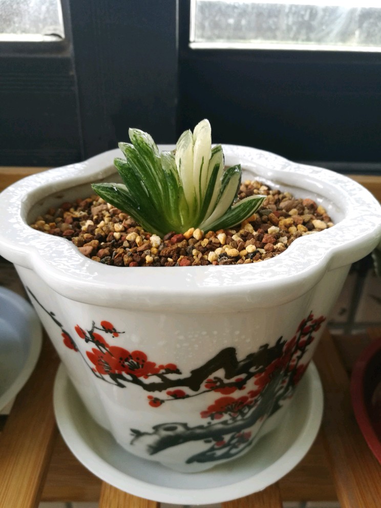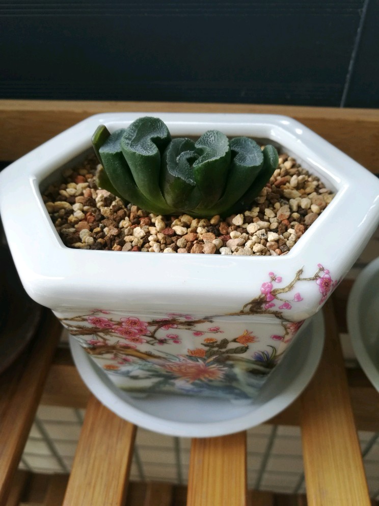万象盆是专门用来养十二卷植物的花盆,但似乎并不适合其中的玉扇,长方形或椭圆形开口的多肉盆和玉扇应该最为匹配。我在网上淘到了一个高仿的清光绪粉彩花鸟六方小花盆,特别适合养玉扇,而且有锦上添花之美感。