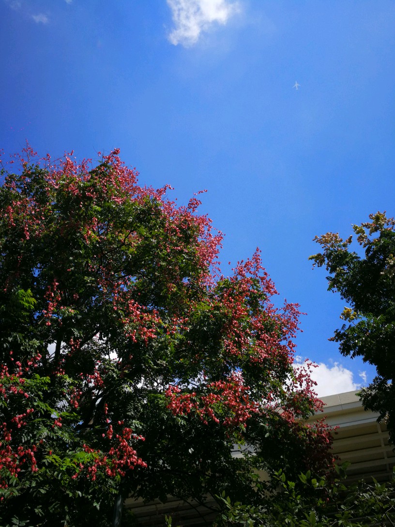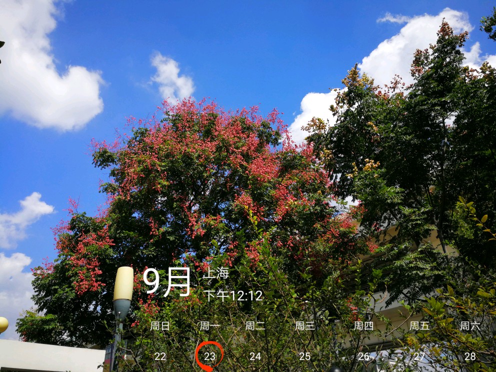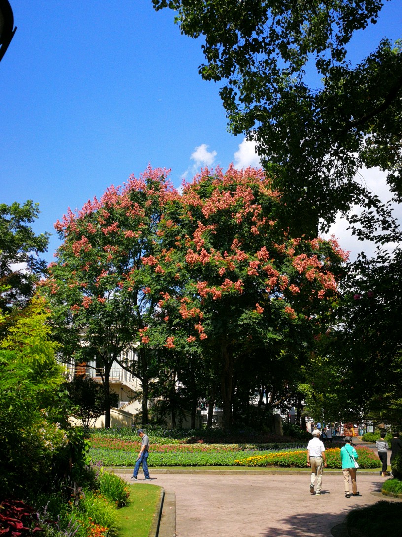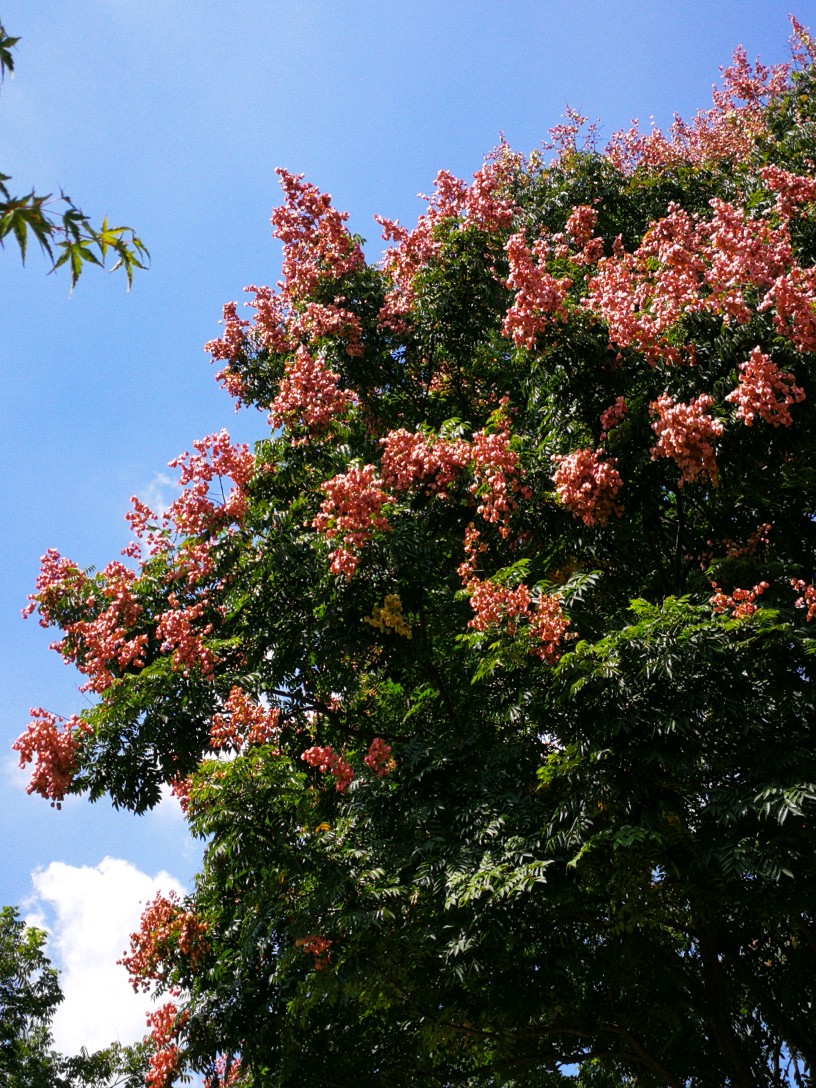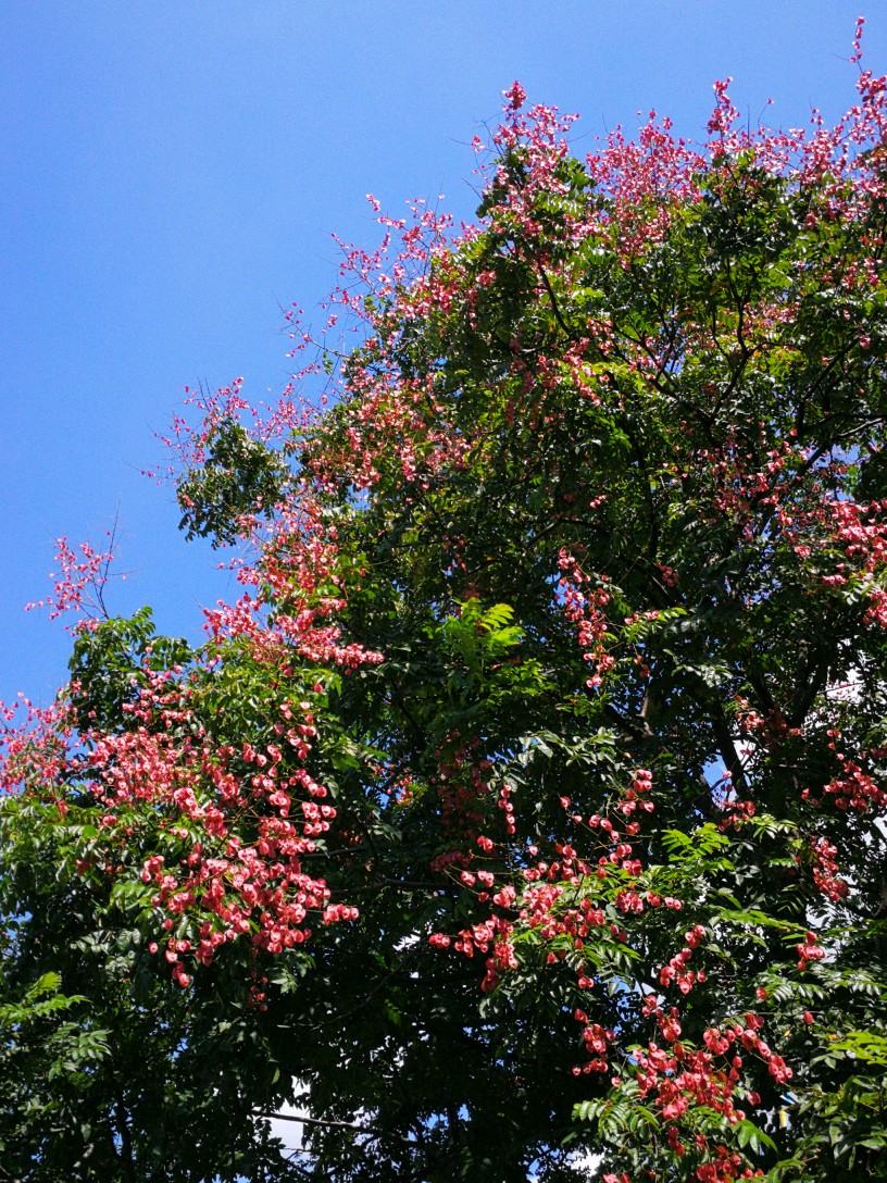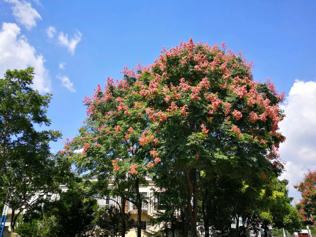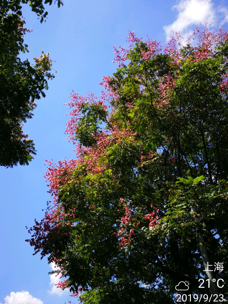 栾树秋来夏花落尽,即有蒴果挂满枝头,如盏盏灯笼,绚丽多彩。也多见花果同枝,煞是好看。
