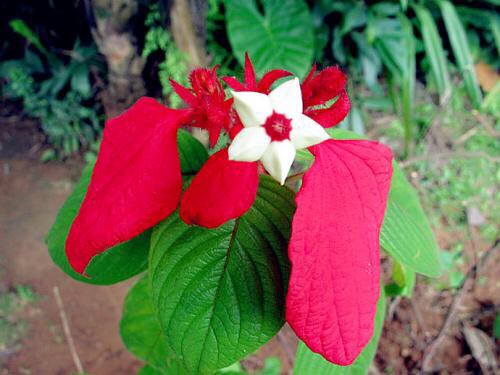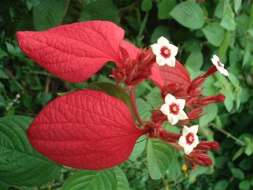 红纸扇(学名:Mussaenda erythrophylla Schumach. & Thonn.)是茜草科玉叶金花属植物。为多年生常绿灌木。植株高1.5-2米,树冠广圆形,分枝多,茎干绿色至深褐色。叶宽卵圆形,亮绿色,中脉及例脉密生红线毛,长8-15厘米。幼枝、幼叶均被淡黄色的长绵毛聚伞花序顶生,花长约4厘米,花筒红色,裂片黄色,单花期长20余天,整个花期甚长,从夏至秋盛开。不结实。