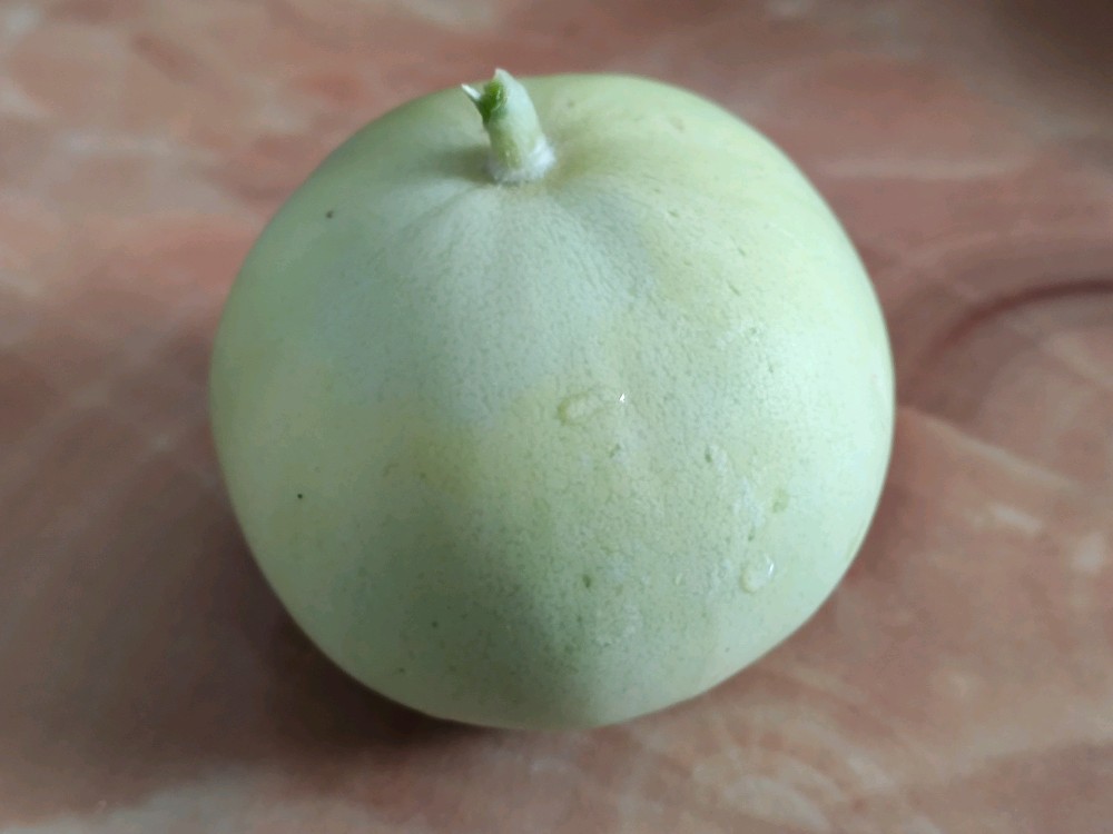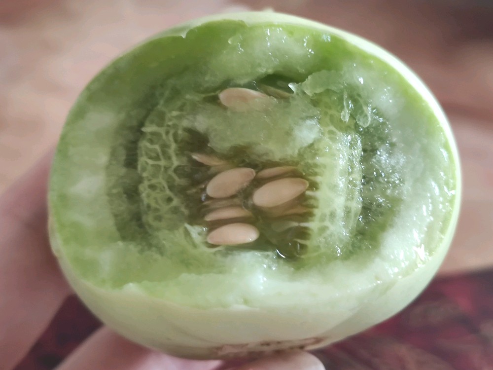 我自己的瓜没能守住,老爸倒是从别处给我摘了个小瓜。别看它颜色还没有图一的好,可闻着就是一股浓郁的香甜味儿。咬了一口,还真甜!