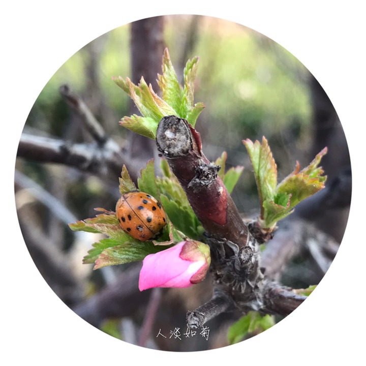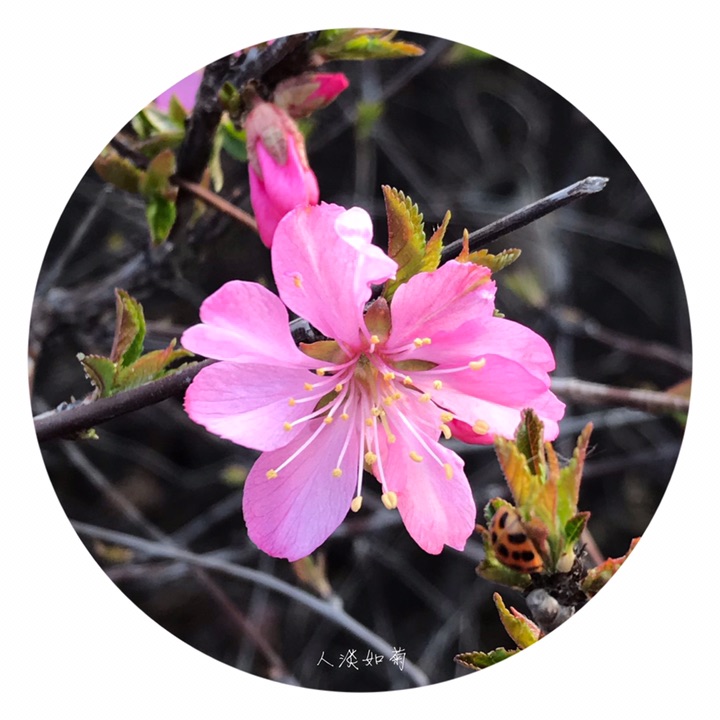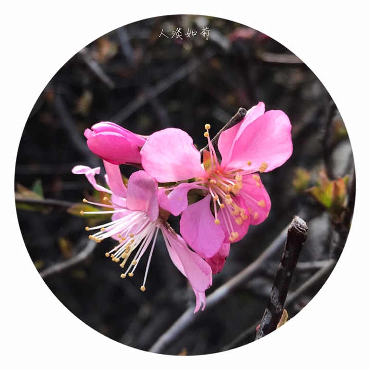 枝紫褐色,叶宽椭圆形至倒卵形,先端3裂状,缘有不等的粗重锯齿;花单瓣至重瓣,紫红色,1~2朵生于叶腋,花期4月;核果红色,近球形,有毛。