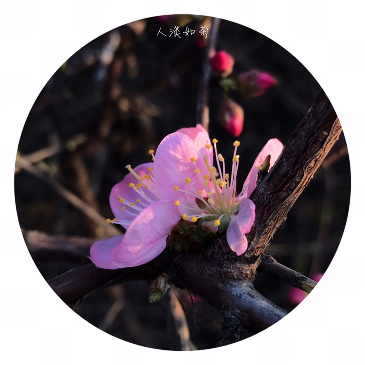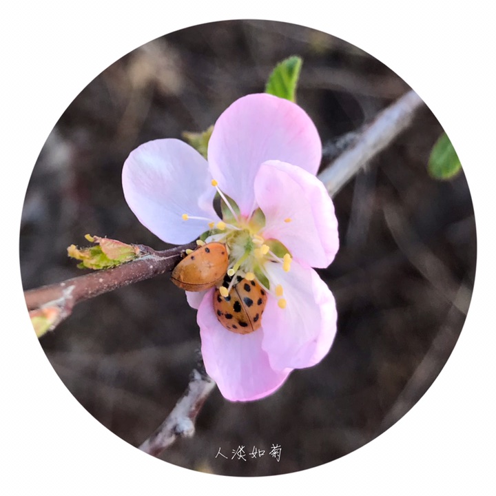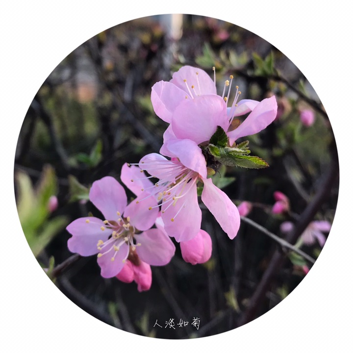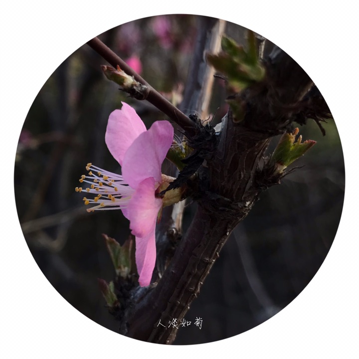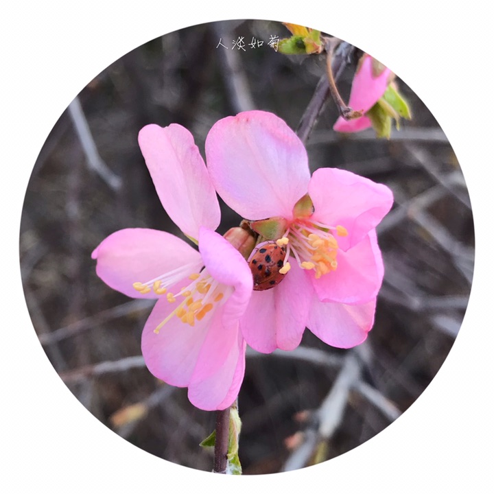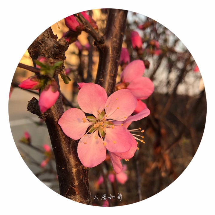 花1-2朵,先于叶开放,直径2-3厘米;花梗长4-8毫米;萼筒宽钟形,长3-5毫米,无毛或幼时微具毛;萼片卵形或卵状披针形,无毛,近先端疏生小锯齿;花瓣近圆形或宽倒卵形,长6-10毫米,先端圆钝,有时微凹,粉红色;雄蕊约25-30,短于花瓣;子房密被短柔毛,花柱稍长于雄蕊。