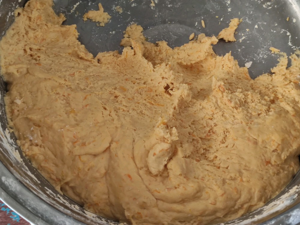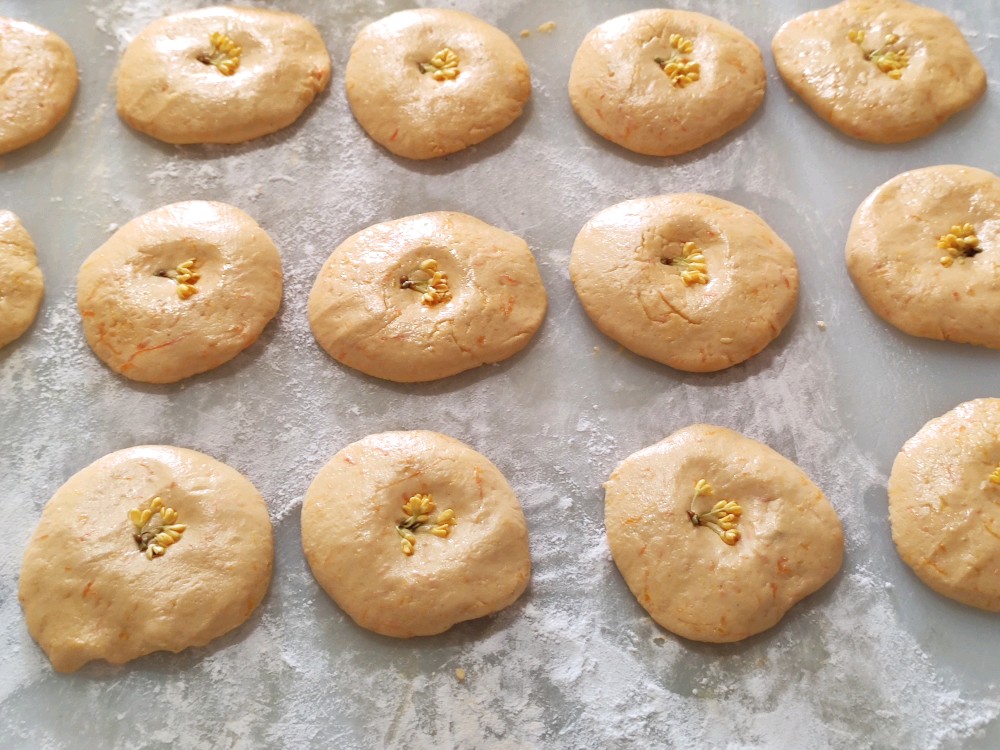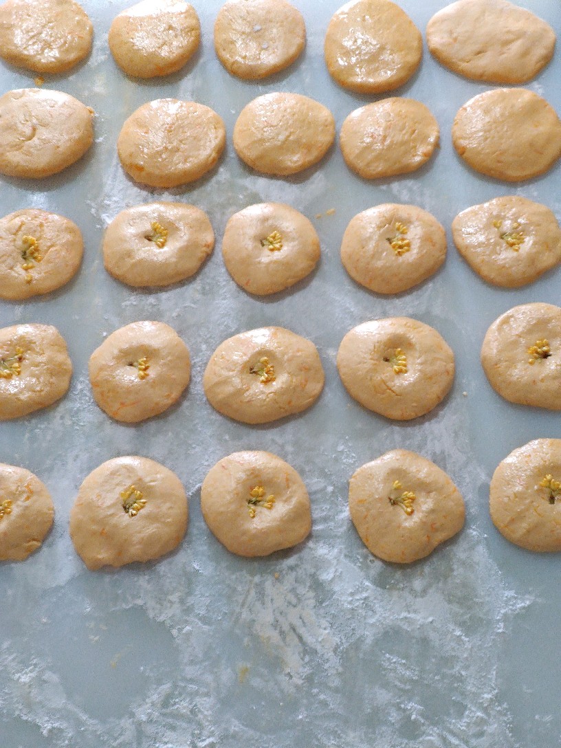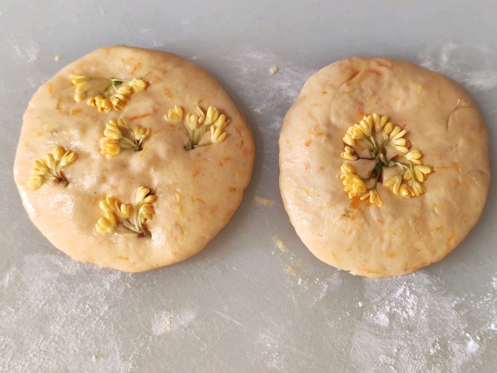 加入少许糖,糯米粉,揉成面团,做饼开始。想着上午刚采了点桂花,应该可以放上去吃吃。