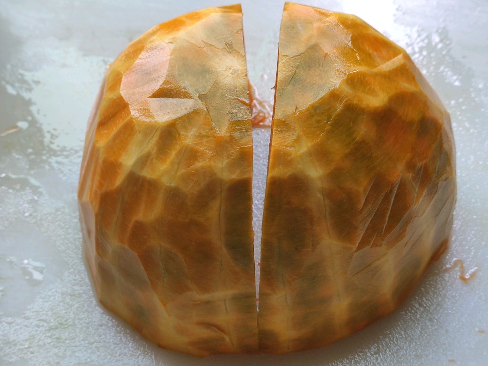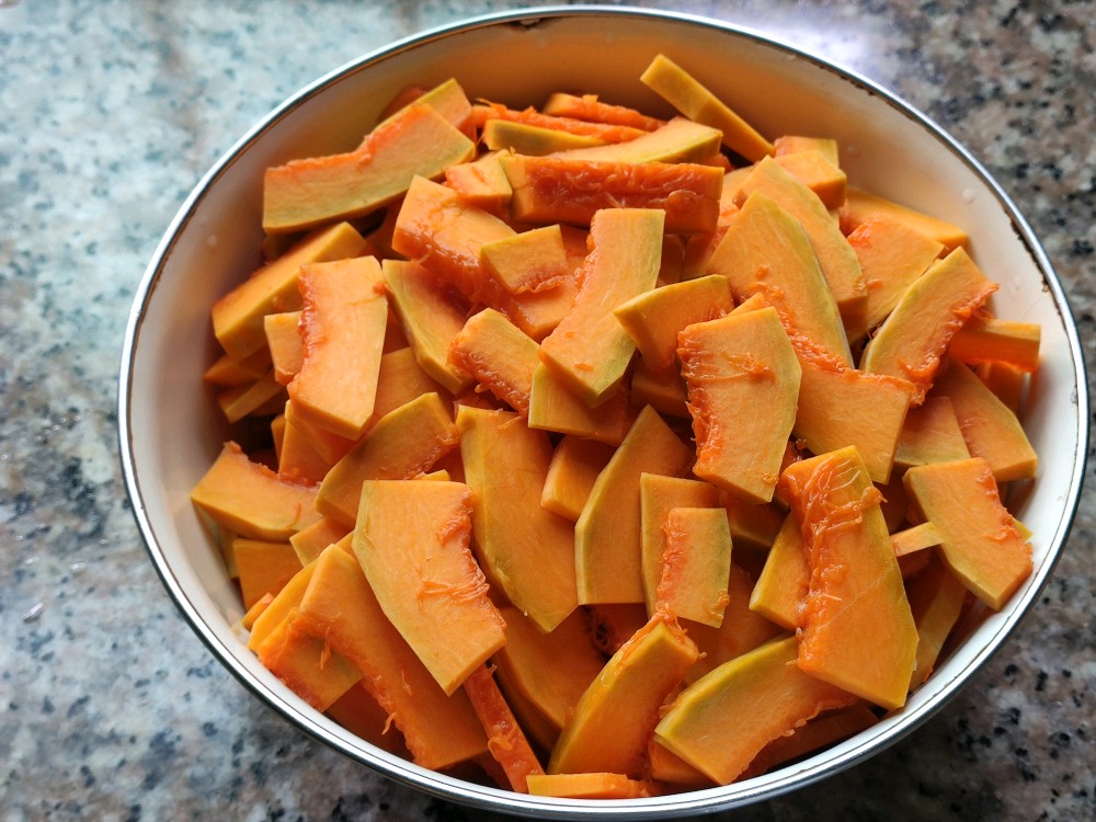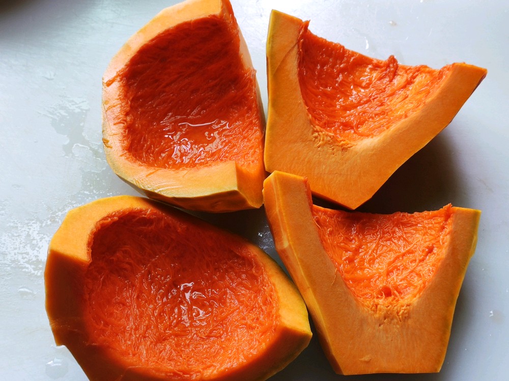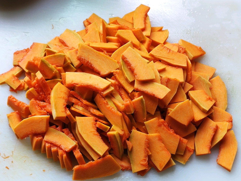 南瓜切皮硬硬的不好弄,可以切大块蒸熟后去皮方便