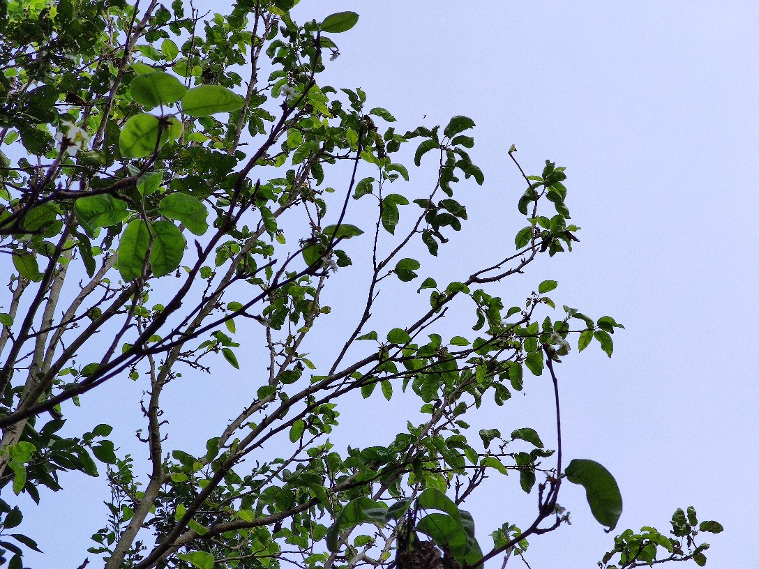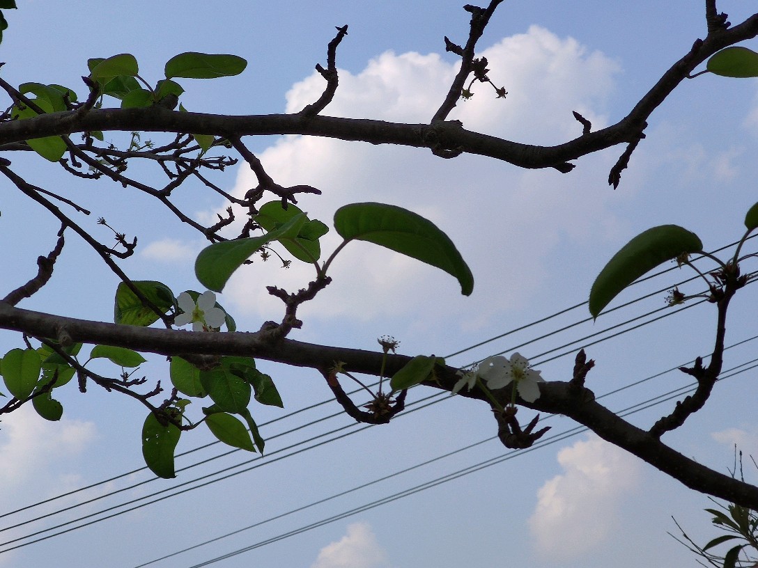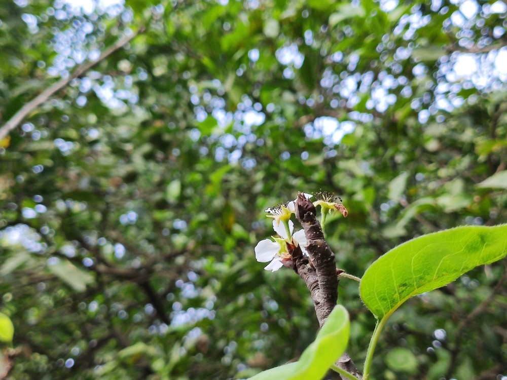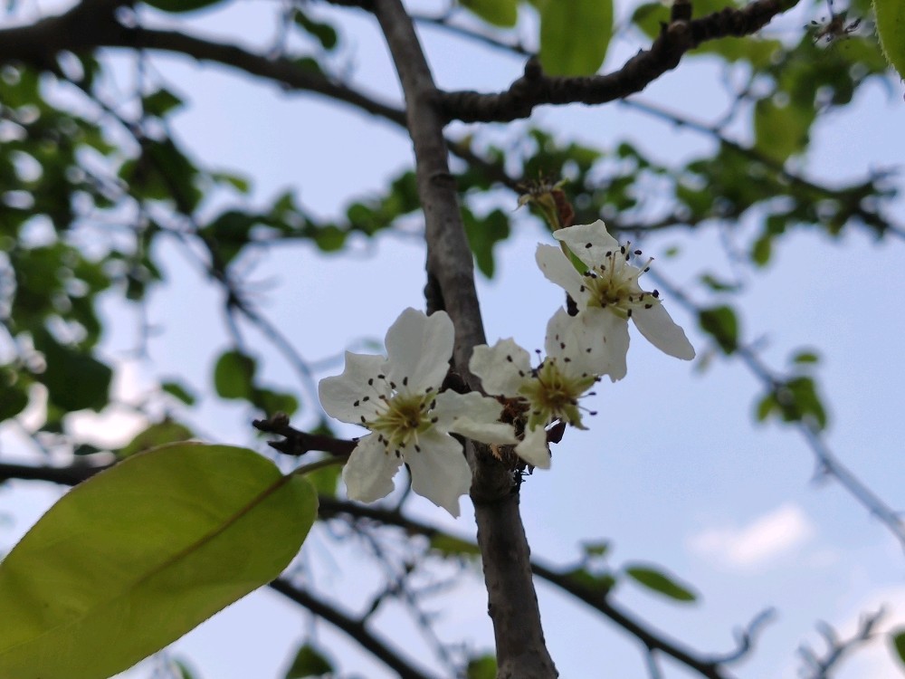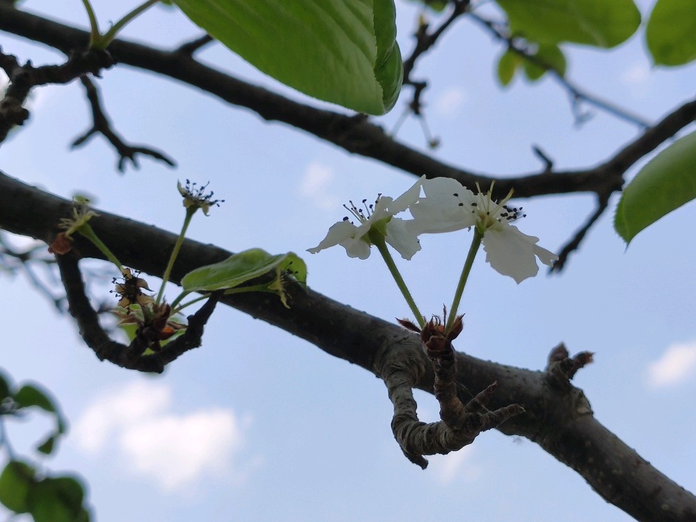梨花这次也拖离带水了,这稀拉拉的一开,也一月有余了吧。现在,叶子几乎都长齐了,在一片绿意盎然中却还能看到几枚白色的花朵绽放在枝头。我努力找寻着小梨子的存在,可转了一圈又一圈,实在是没看到它的踪影。这是咋回事儿呢?往年都能结小梨子的,这次怎么看不到踪迹了呢