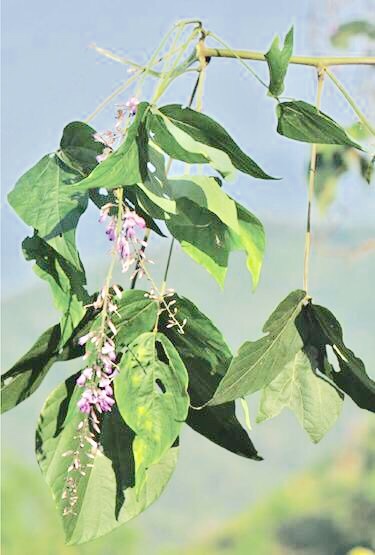 葛〔拉丁学名:Pueraria lobata(Willd.)Ohwi〕:豆科,葛属多年生草质藤本植物,块根肥厚圆柱状,叶互生,项生叶片菱状卵圆形,总状花序,腋生,蝶形花冠,紫红色。荚果长条形,扁平,密被黄褐色硬毛。7-8月开花,8-10月结果。