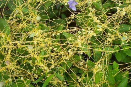 菟丝子(学名:Cuscuta chinensis Lam.),别名禅真、豆寄生、豆阎王、黄丝、黄丝藤、金丝藤等。一年生寄生草本。茎缠绕,黄色,纤细,无叶。花序侧生,少花或多花簇生成小伞形或小团伞花序;苞片及小苞片小,鳞片状;花梗稍粗壮;花萼杯状,中部以下连合,裂片三角状;花冠白色,壶形;雄蕊着生花冠裂片弯缺微下处;鳞片长圆形;子房近球形,花柱2。蒴果球形,几乎全为宿存的花冠所包围。种子2-49,淡褐色,卵形,长约1毫米,表面粗糙。
