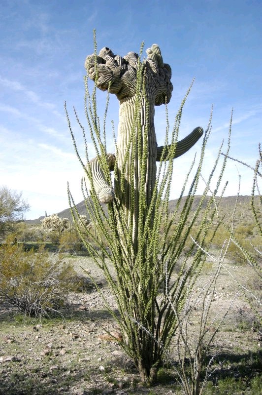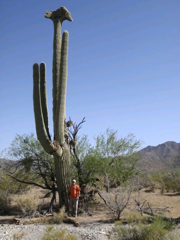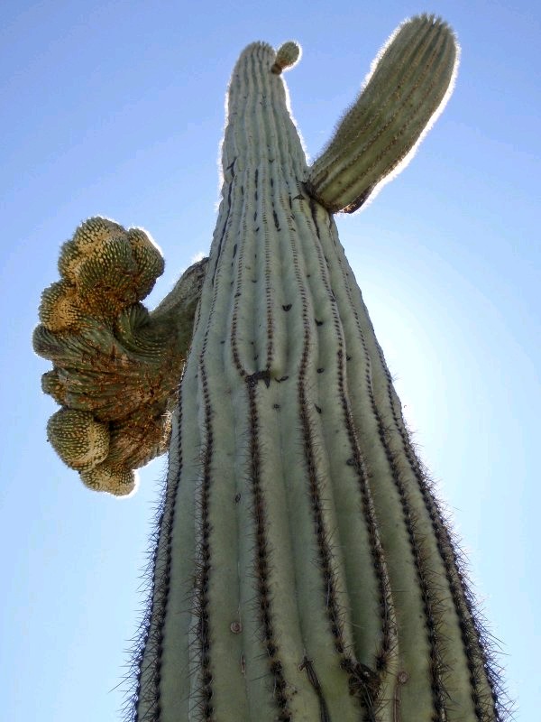 巨柱仙人掌是美国与墨西哥交界处索诺拉沙漠的灵魂植物,身姿高大如树干,且巨掌一柱冲天。长成这种巨掌得花很长时间,通常在它70岁时的成熟期才能见到。巨柱仙人掌长如大柱,有六七层楼高,是世界上二千多种仙人掌中身形最高大的,亚历桑那州车牌中的仙人掌就是它。高及15米,重达10吨,生存期逾二百年;暴风雨来时可在一日内吸收一吨重的水,而有“骆驼仙人掌”之称。为了适应乾旱的沙漠环境,其叶已退化成针刺以减少水分蒸发,又深又广的根系遇水就吸。它忍受干旱的能力十分惊人,这是因为它那特殊的贮水本领。厚茎能贮住大量水分,如同小水库,当地过路人常将之砍开取水解渴,喝个痛快。[5]