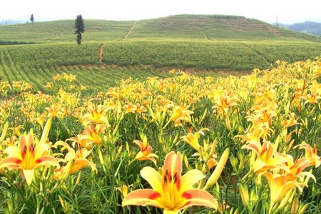 叶较宽,为深绿色,长75cm,宽1.5-2.5cm,花序上着生花多达30朵左右,花序下苞片呈狭窄的三角形;在全国各地都有分布,尤其是在湖南省官家嘴镇为最多,是国家黄花菜的原产地。