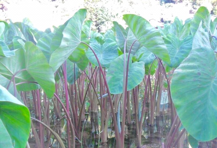 紫柄芋,是属于天南星科植物。多年生草本。植株高可达1.2m,地下有球茎,叶柄及叶脉紫黑色,十分醒目。块茎粗厚。侧生小球茎,倒卵形,表面生褐色须根。叶1-5,由块茎顶端生出,高1-1.2m;叶柄圆柱形,向上渐细,紫褐色;叶片盾状着生,卵状箭形,长40-50cm,宽25-30cm,深绿色,基部具弯缺,侧脉粗壮,边缘波状。花序柄单1,外露部分长12-15cm,粗1cm,先端污绿色,其余与叶柄同色。