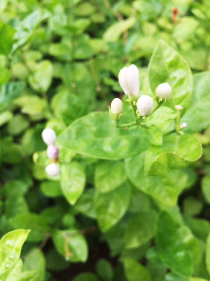 看那翠绿的叶子间,就开出了一朵朵小而雪白的茉莉花。茉莉花的花瓣极小,给人一种小而淡雅的感觉,它的花瓣中有一个个小小的,嫩黄的花蕊。一阵微风吹来,茉莉花在风中摇曳,散发出一阵阵淡而不腻的清香,沁人心脾、令人陶醉。