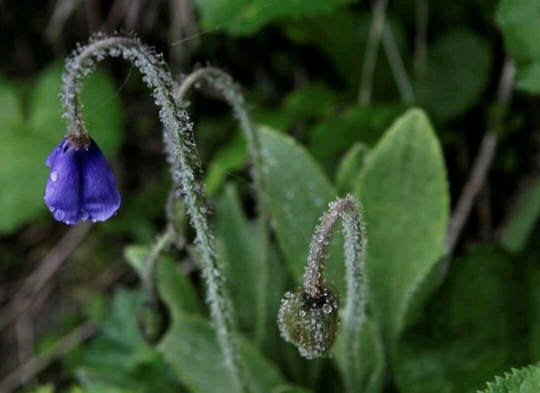 多年生草本,高30-50厘米,基部盖以宿存的叶基,其上密被淡黄色或棕褐色、具多短分枝的硬毛。须根纤维状,细长。叶全部基生,莲座状,叶片倒卵形至披针形,长2-9厘米,宽1-3厘米,先端急尖或钝,基部渐狭并下延入叶柄,边缘全级,两面密被淡黄色或棕褐色、具多短分枝的硬毛.明显具3-5条纵脉;叶柄长3-6厘米。花葶1-3,具肋,被棕黄色、具分枝且反折的硬毛,上部毛较密。花单生于基生花葶上,下垂。花芽宽卵形;萼片长约2厘米,宽约1.5厘米,外面密被棕黄色、具分枝的硬毛;花瓣4-6,倒卵形或近圆形,长3-4厘米,宽2.5-3.7厘米,淡蓝色或紫色;花丝丝状,长1.5-2厘米,与花瓣同色或白色,花药长圆形,长1-1.5毫米,淡黄色;子房近球形、卵珠形或长圆形,长5-8毫米,密被棕黄色、具分枝的刚毛,花柱短,长1-1.5毫米,柱头头状,3-6裂。菇果椭回形或长圆状椭圆形,长1.5-2.5厘米,密被紧贴的刚毛,3-6摇自顶端微裂。种子狭卵形。