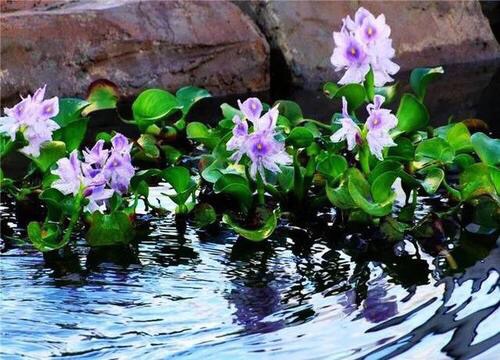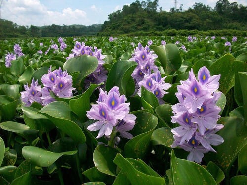 凤眼蓝(学名:Eichhornia crassipes (Mart.) Solms)浮水草本。须根发达,棕黑色。茎极短,匍匐枝淡绿色。叶在基部丛生,莲座状排列;叶片圆形,表面深绿色;叶柄长短不等,内有许多多边形柱状细胞组成的气室,维管束散布其间,黄绿色至绿色;叶柄基部有鞘状黄绿色苞片;花葶多棱;穗状花序通常具9-12朵花;花瓣紫蓝色,花冠略两侧对称,四周淡紫红色,中间蓝色,在蓝色的中央有1黄色圆斑,花被片基部合生成筒;雄蕊贴生于花被筒上;花丝上有腺毛;花药蓝灰色;花粉粒黄色;子房长梨形;花柱长约2厘米;柱头上密生腺毛。蒴果卵形。花期7-10月,果期8-11月。