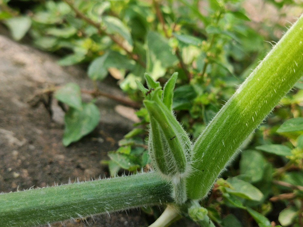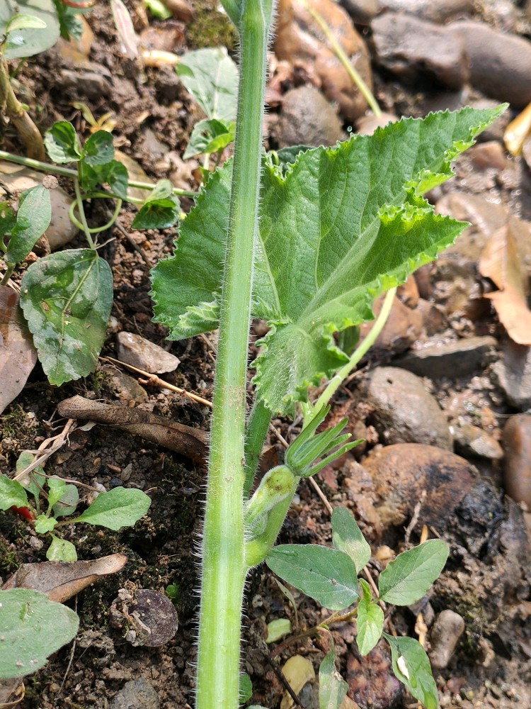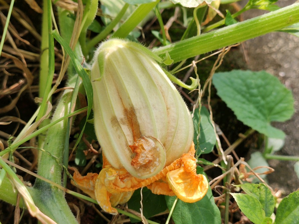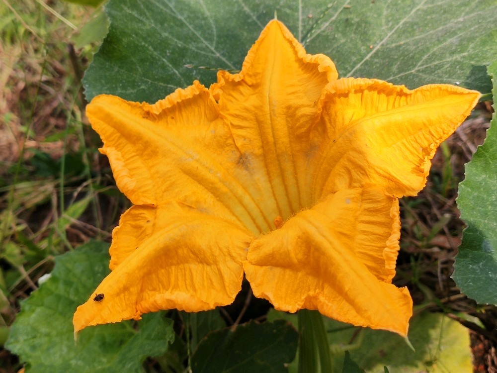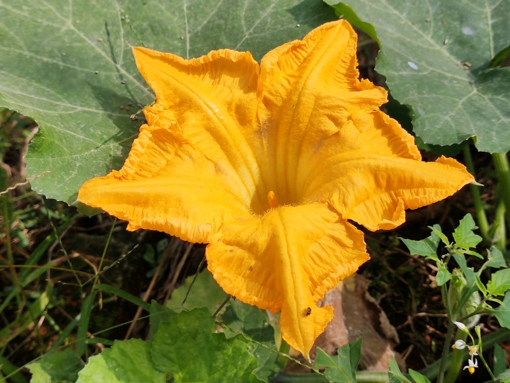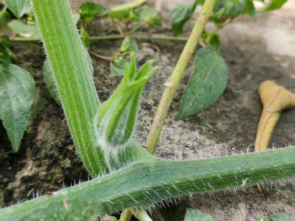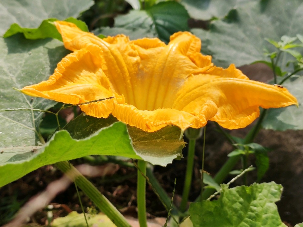 这是不小心遗落的南瓜种子长起来的,就在水井旁。因为水分的充沛,长势颇有点来势汹汹的凶猛,这不才没几天就已经开花了