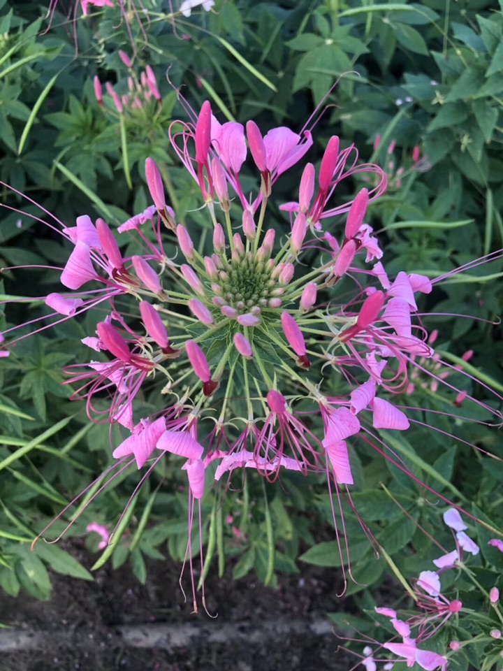 叶片为掌状复叶,小叶5枚-7枚,为矩圆状披针形;总状花序顶生,花由底部向上次第开放,花瓣披针形向外反卷,花苞红色,花瓣呈玫瑰红色或白色,雄蕊特长;蒴果圆柱形,种子浅褐色。花期在6月-9月,其花茎长而壮实,花朵盛开时,总状花序形成一个丰满的花球,朵朵小花犹如翩翩起舞的蝴蝶,非常美观。