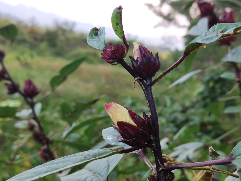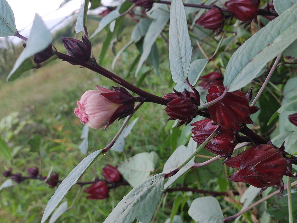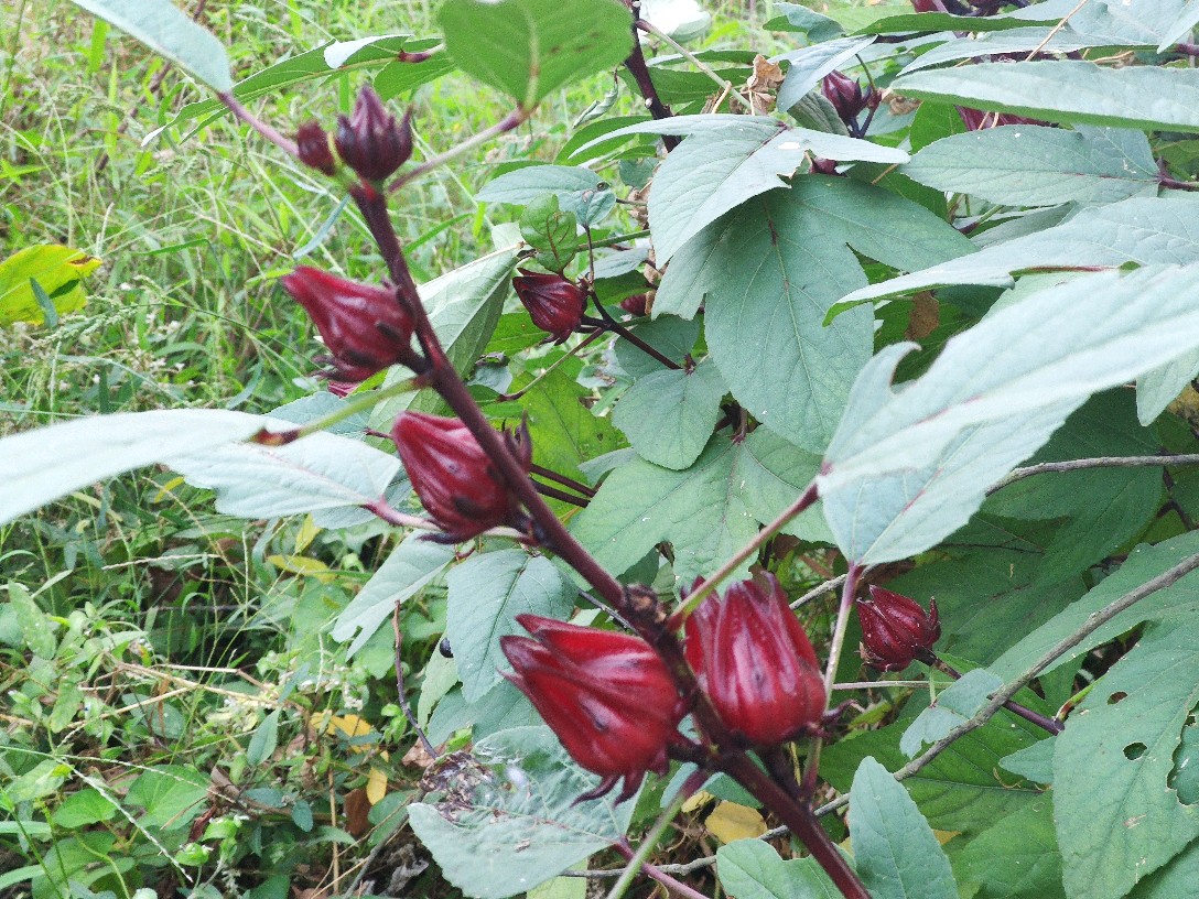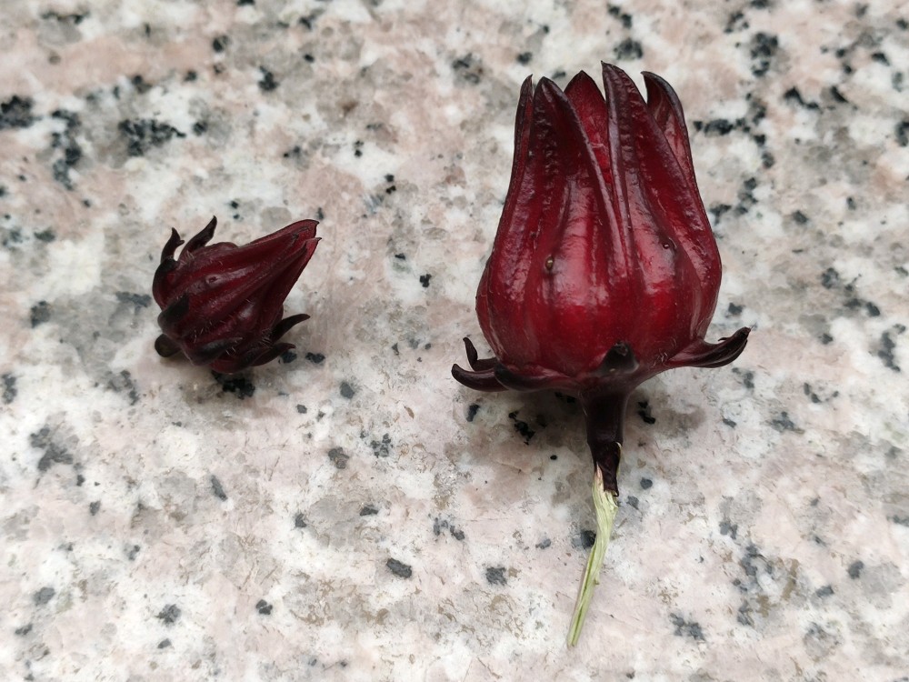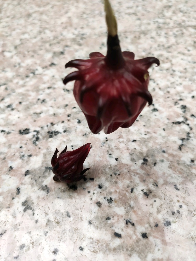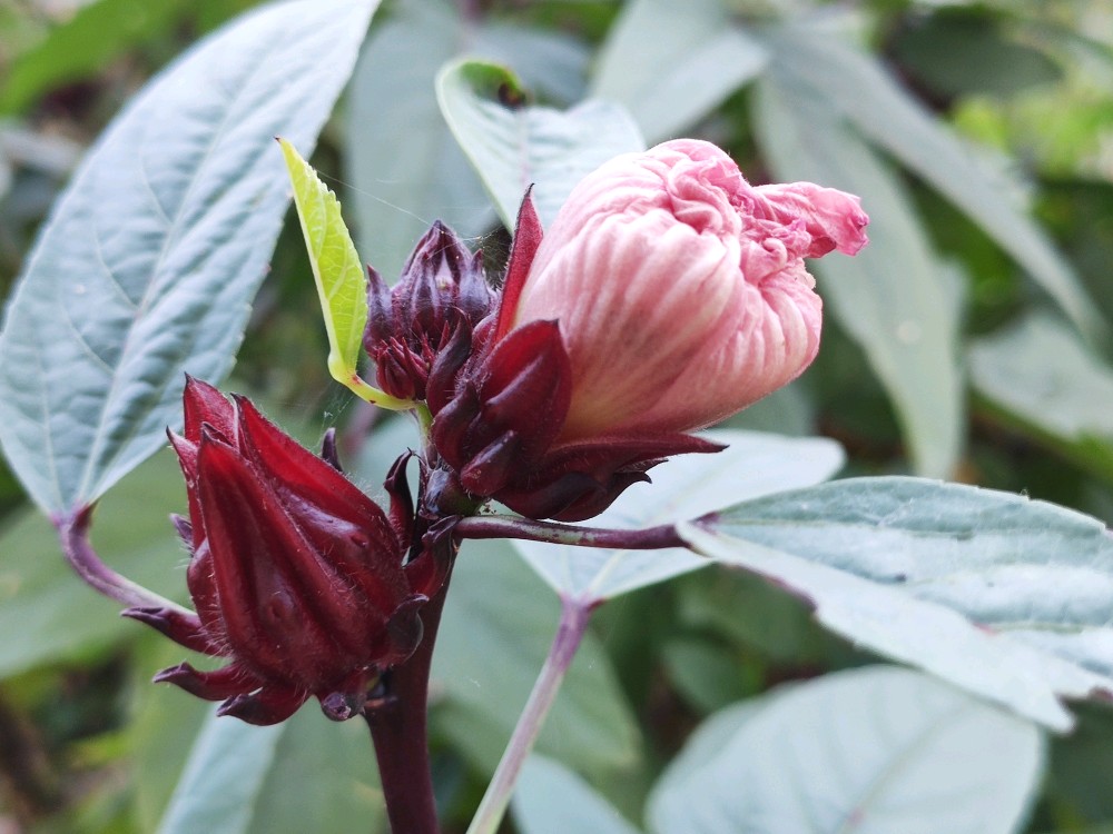 记得印象中的洛神花茶是酸酸的,对于这新鲜的我却没有勇气去尝尝,只是摘了一大一小两个估计一个为果子一个为花苞把玩了一下。小的一掰就下来了,大的倒是扯了老半天。