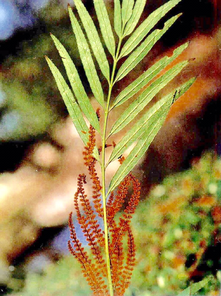 根状茎短粗或为圆柱状的主轴高出地面,顶端叶丛簇生。叶为一型,柄长1.5-20厘米,红棕色或棕禾秆色;叶片为长圆形,长30-40厘米。宽15-24厘米,急尖头,幼时通体被淡棕色绒毛,成长后逐渐脱落,或部分残留叶轴上,二回羽状深裂;羽片18-25对,对生或近对生,相距2-3厘米,平展或上部的略斜向上,无柄,长8-12厘米,宽2-3厘米,披针形,急尖头,基部近截形,向顶部的羽片逐渐缩短,羽状深裂几达羽轴;裂片彼此接近,14-18对,长圆形,圆头,长1-1.5厘米,宽4-6毫米,全缘。叶脉纤细,分歧,或基部上方一脉再次分歧,小脉达于叶边,两面明显,但不甚隆起。叶为草质,干后为黄绿色,叶轴上多少有淡红色的绒毛。基部1-2对营养羽片以上的羽片为能育,能育羽片2-3对,大大缩短,暗棕色,被有淡红色绒毛。