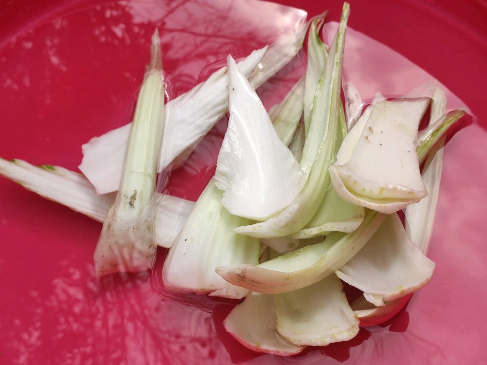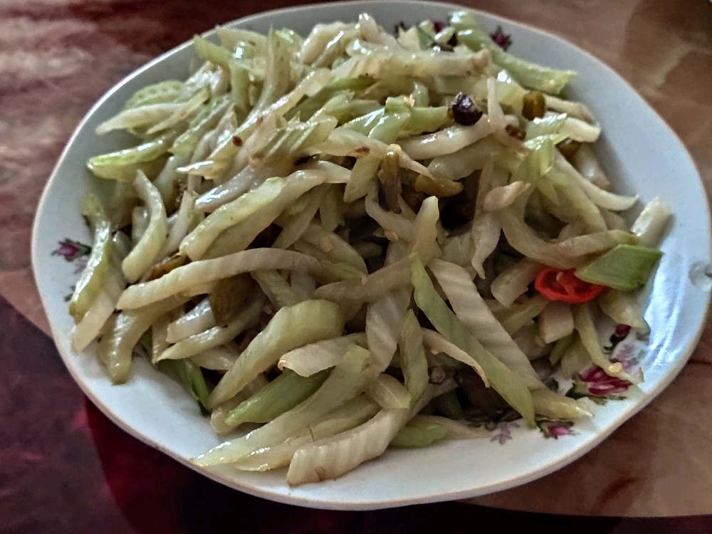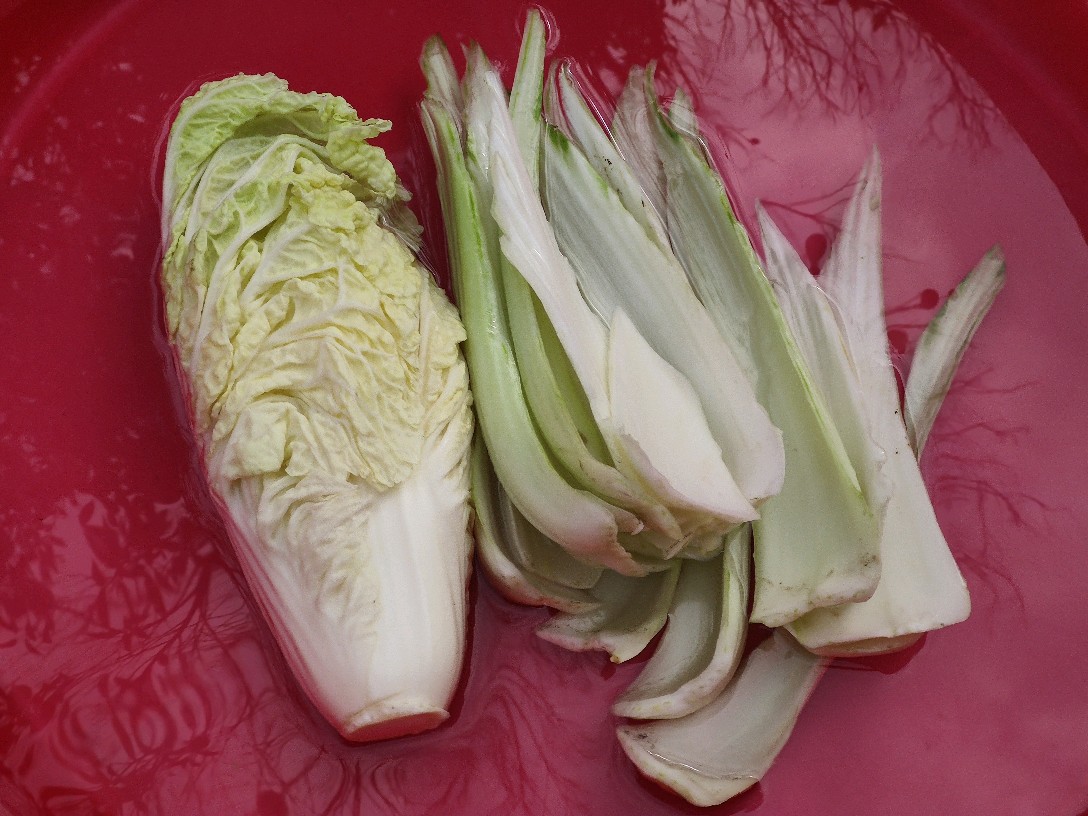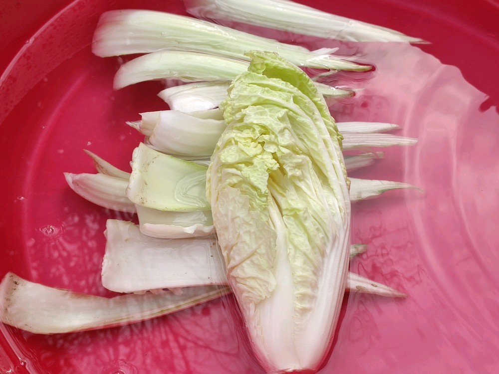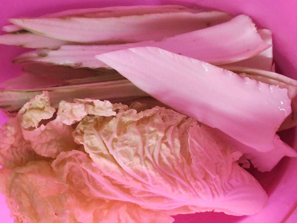 和小白菜一块儿拿过来的还有这么一大棵大白菜,由于没有打农药的缘故,这菜叶子都让虫子啃食了。干脆就做泡椒菜梗吧,用刀咔咔几下把叶子全剥离干净,就剩了中心那么一点儿。