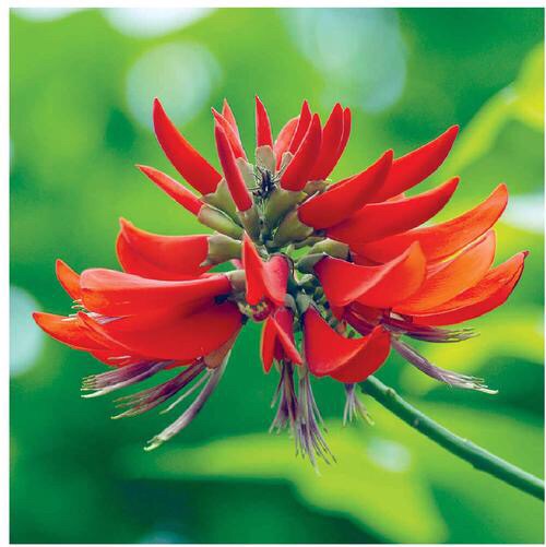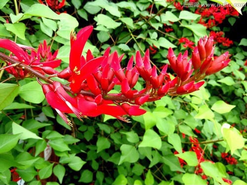 龙牙花红叶扶疏,初夏开花,深红色的总状花序好似一串红色月牙,艳丽夺目,适用于公园和庭院栽植,若盆栽可用来点缀室内环境。是阿根廷国花。(概述图片参考资料来源: