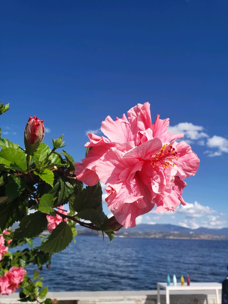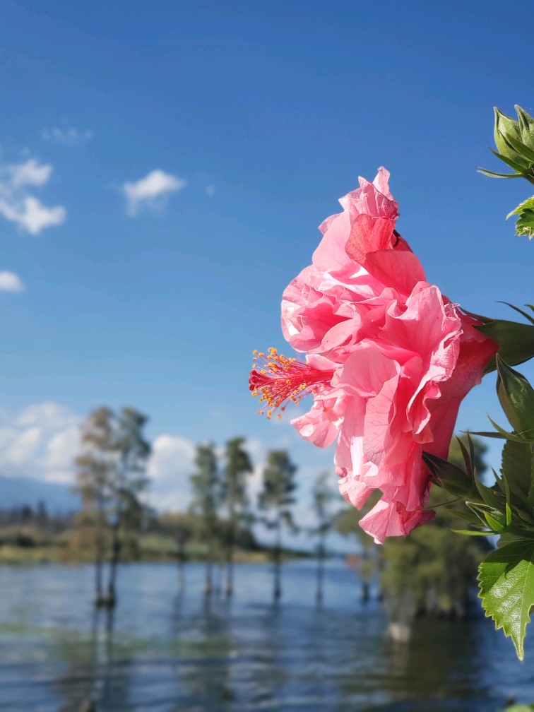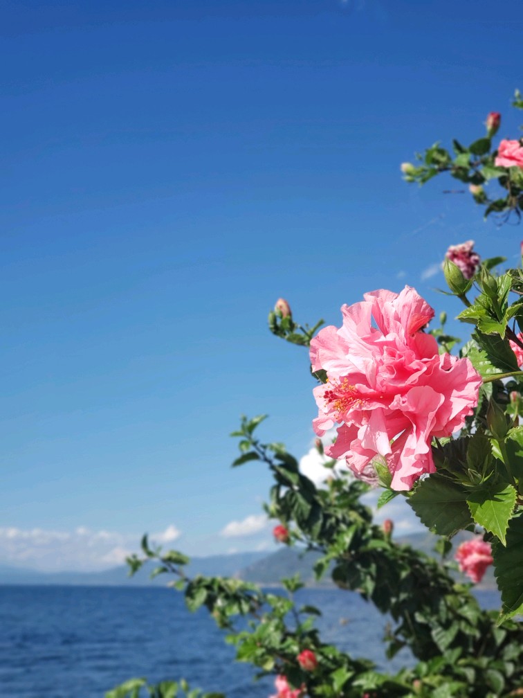 去朋友的客栈喝茶,偶遇的一棵朱槿。蓝天白云再加粉红,这个配色真的不要太美。