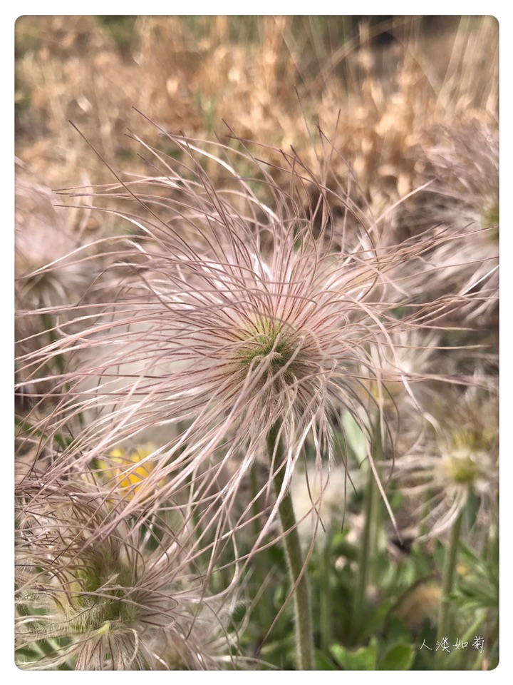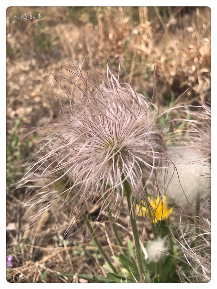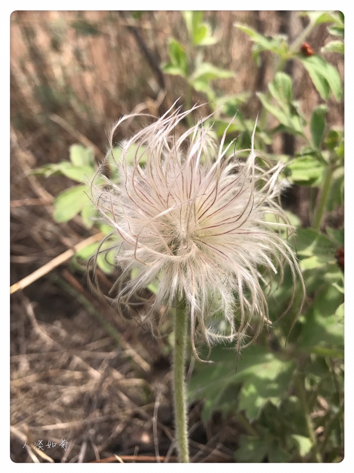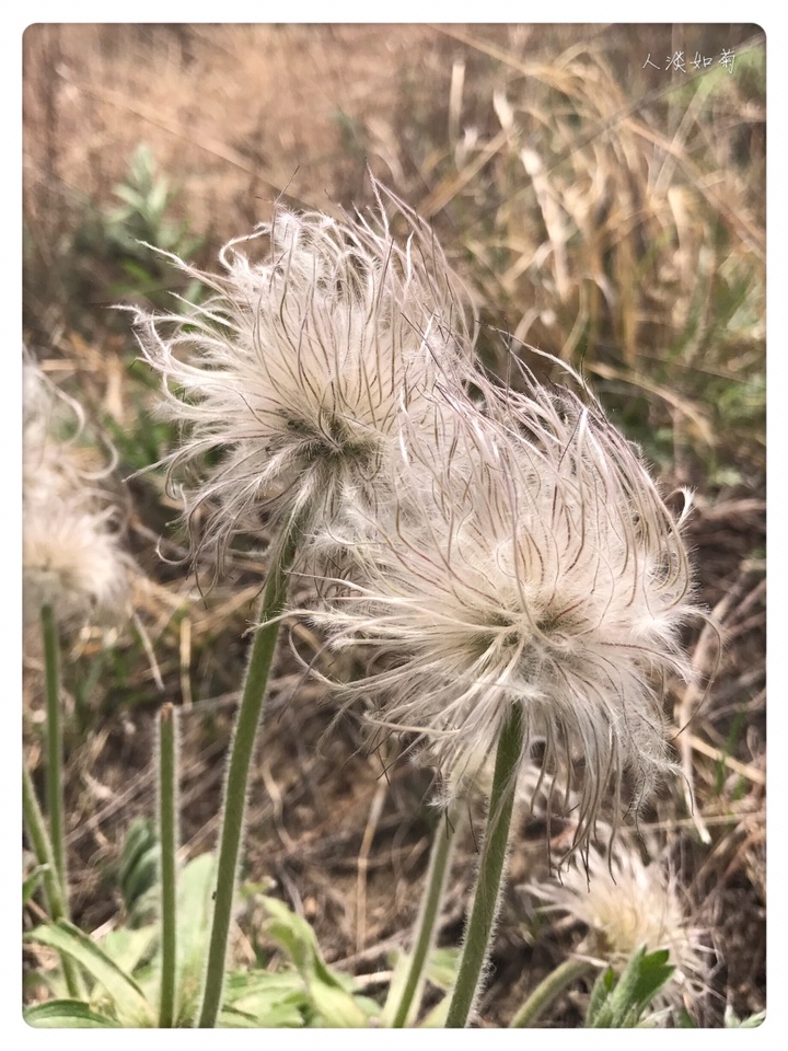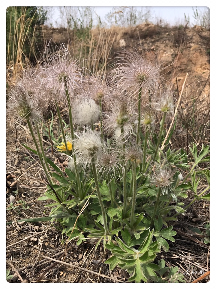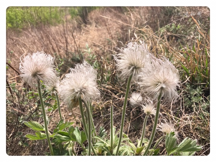 早春,在许多植物还没有发芽的时候,白头翁已经结实了,春风中果实上长长的柔毛随风而舞,在还未返青枯草的陪衬下到有几分秋的感觉。
