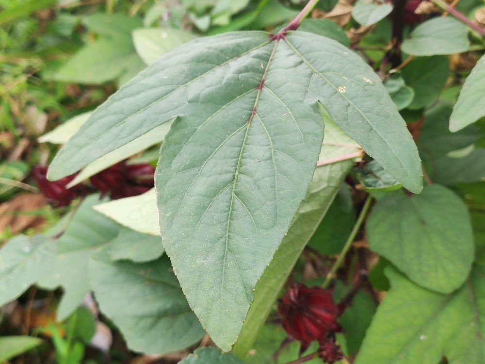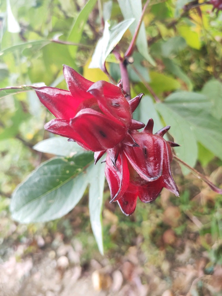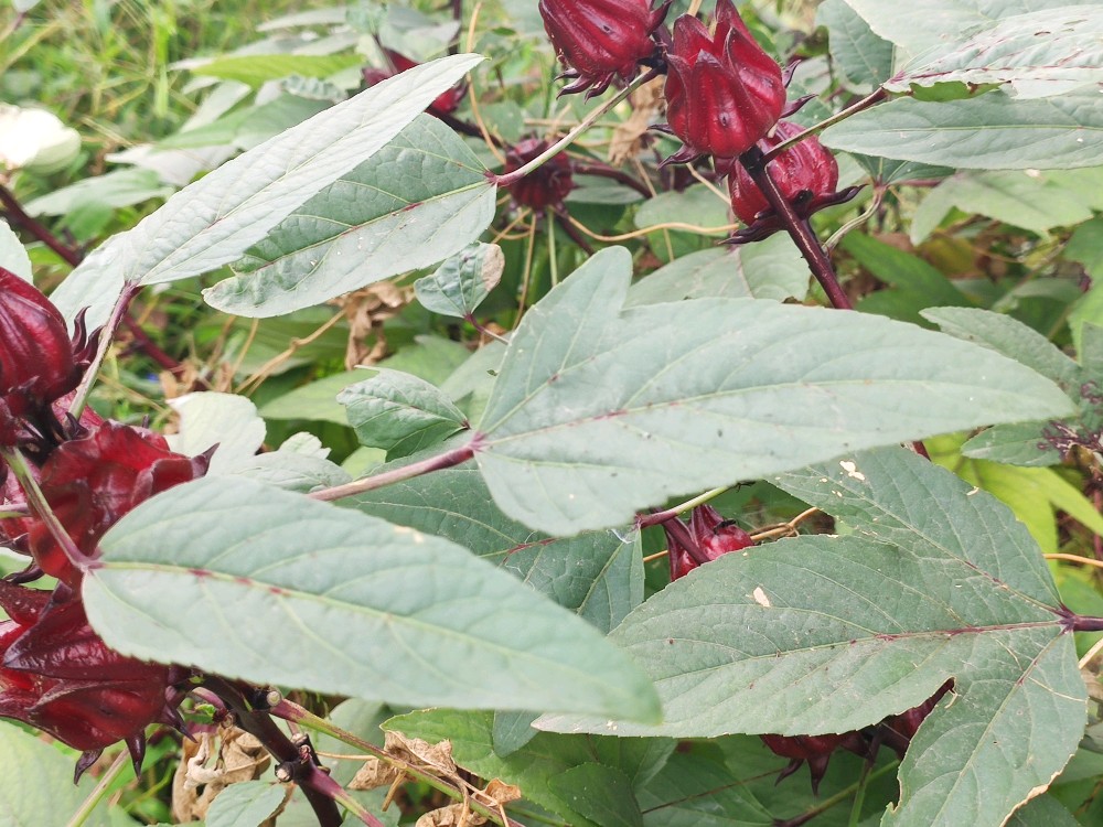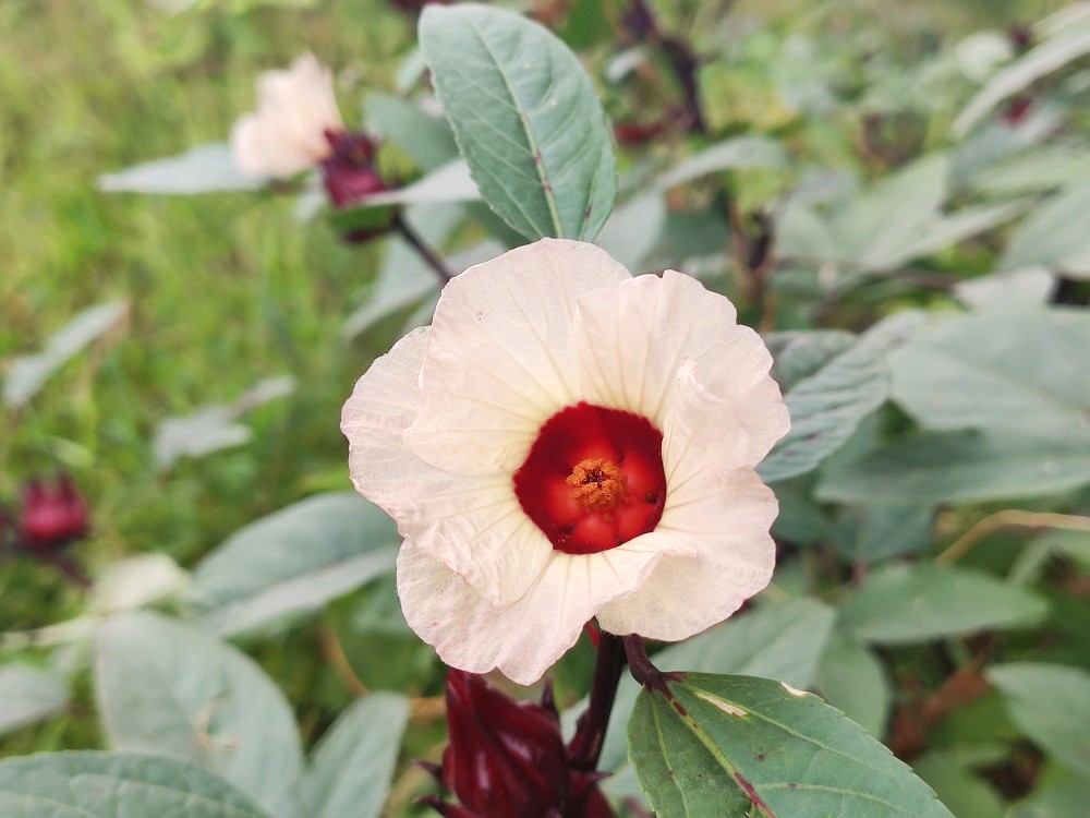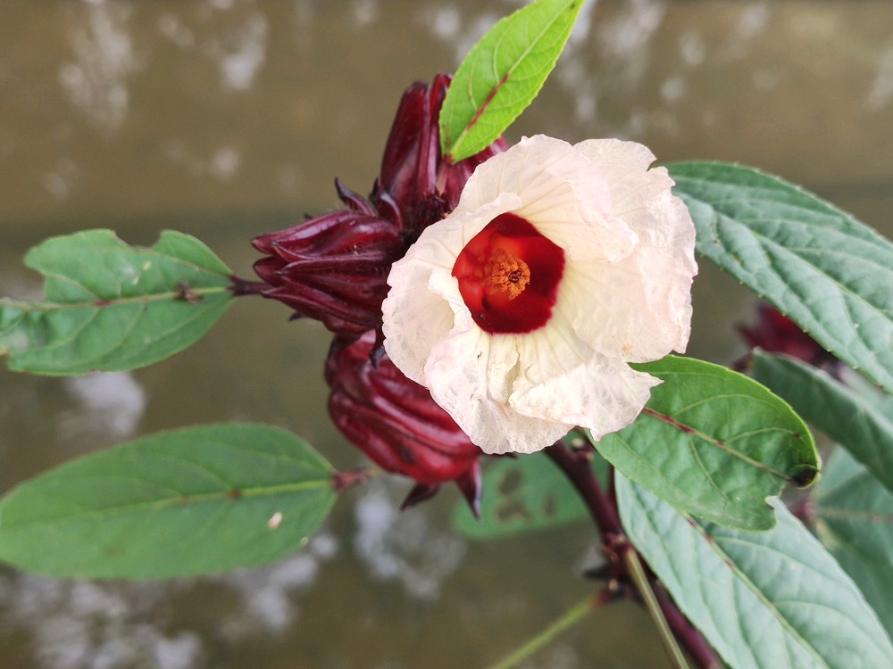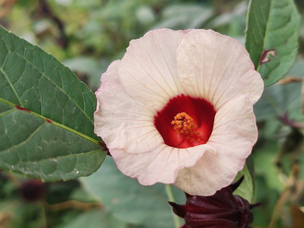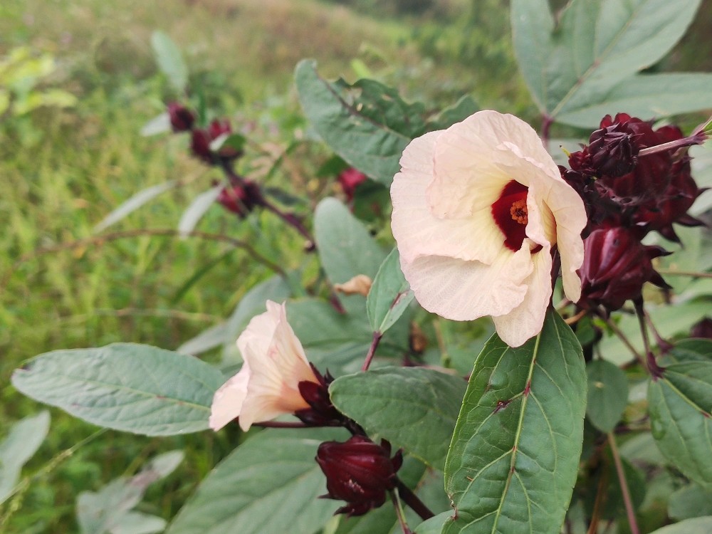 一看花便知玫瑰茄是木槿属的,特点就是5瓣,单体雄蕊,辨识度很高。它的花花瓣色淡,花心却是鲜红如血,怪不得有洛神心间一滴血的传说。