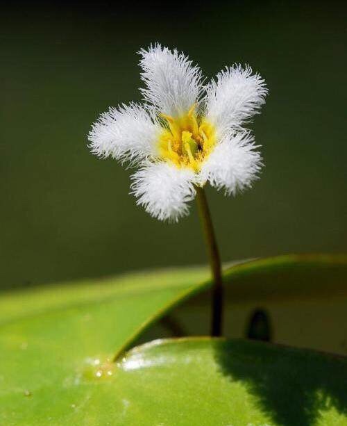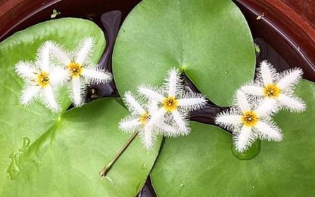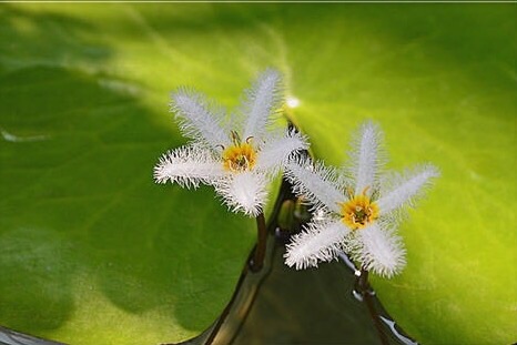 金银莲花(学名:Nymphoides indica (L.) O. Kuntze):多年生水生草本。茎圆柱形,不分枝,形似叶柄,顶生单叶。叶飘浮,近革质,宽卵圆形或近圆形,下面密生腺体,基部心形,全缘,具不甚明显的掌状叶脉,叶柄短,圆柱形,花多数,簇生节上,花梗细弱,圆柱形,不等长,分裂至近基部,裂片长椭圆形至披针形,先端钝,脉不明显;花冠白色,基部黄色,分裂至近基部,冠筒短,裂片卵状椭圆形,先端钝,腹面密生流苏状长柔毛。蒴果椭圆形,花果期8-10月。