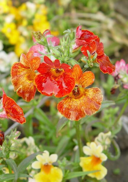 龙面花(学名:Nemesia strumosa Benth.)是玄参科,龙面花属二年生草本植物,株高可达60厦米,光滑直立,叶对生,叶片条状披针形,总状花序,花色白、各种黄、红以及蓝色,喉部黄色常具斑点,4-6月开花。