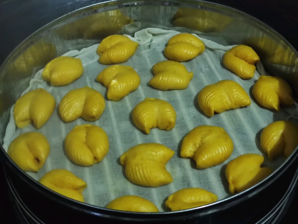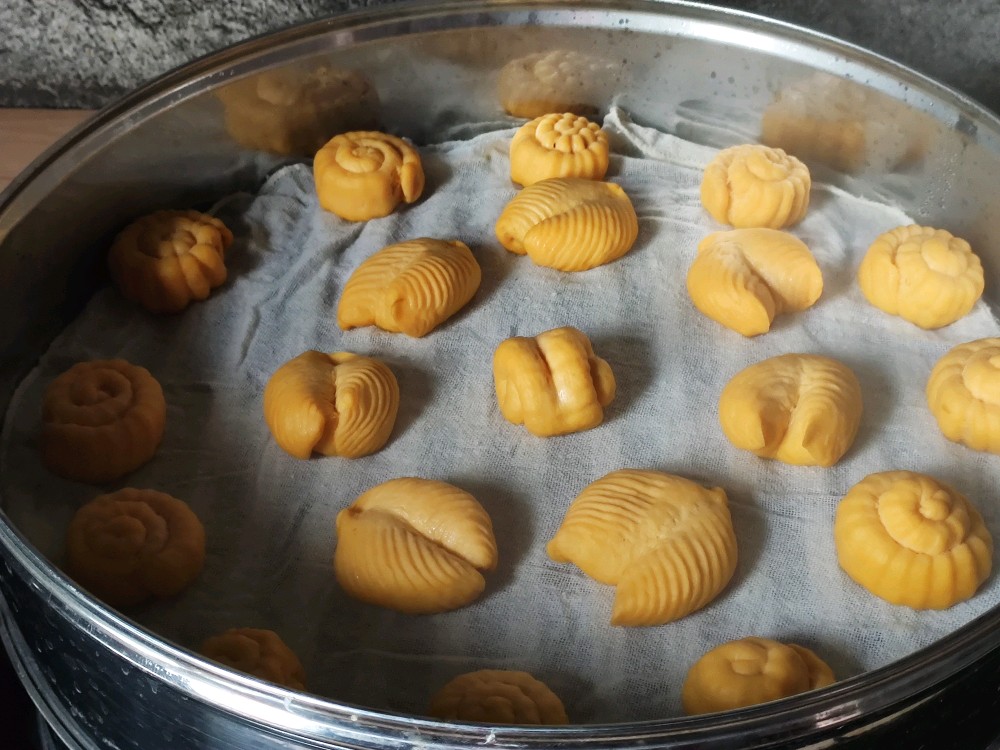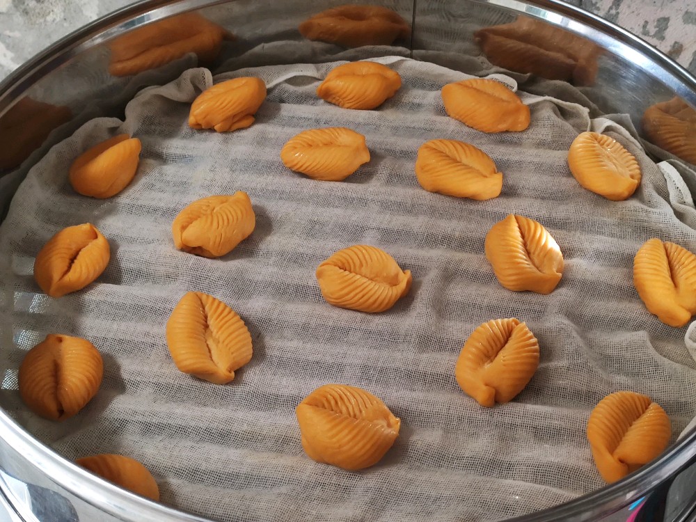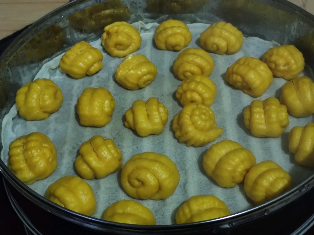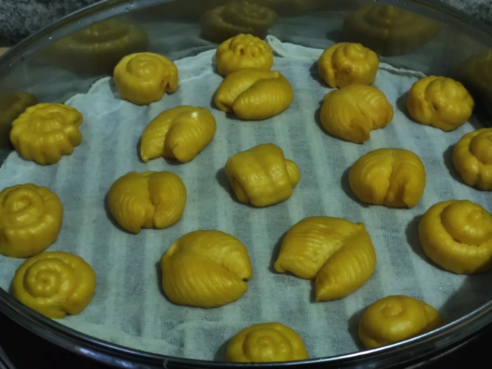 称了一下南瓜2斤7两,把皮和内囊处理掉一称2斤2两。于是跟之前一样切好片上锅蒸,再加入适量糖、面粉揉至细腻,用保鲜膜裹好,温度还是有点低,索性就让它隔着玻璃晒起太阳来。过了一个多点吧,面已发好。又开始自己吭哧吭哧的做起馒头来,上次做了两屉,放的有点拥挤。这次直接又加了一屉,可惜我都开始做第三屉了前面两屉还没有二次膨胀变大,心里就有了这次注定又是一次失败的尝试。