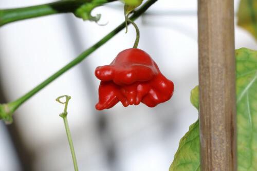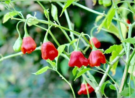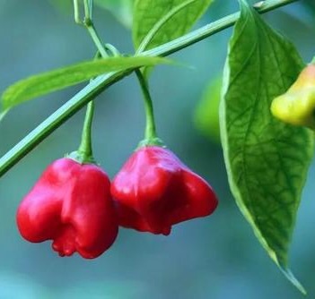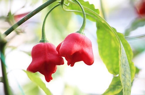 风铃椒即灯笼椒,为一年生茄科植物,原产加拿大,又名乳椒、加拿大椒。株高1-1.2米,茎干粗壮,分枝强,冠幅可达1.45米,叶片绿色、卵形,叶柄长3-4.8厘米,叶片长8-9厘米,每叶腋处着生一朵花,花为白色,果实奇特,果长5厘米左右,灯笼型,果四周有不规则凹凸,中间突出如乳头状,单果重3.5-6克,幼果绿色,成熟后深红色,宛如一只只倒挂金钟,非常艳丽,株结数百个。可观赏也可食用,观赏期达半年之久。适应性强,栽培容易与一般椒类相同,但在生长期要注意枯萎病的防治。