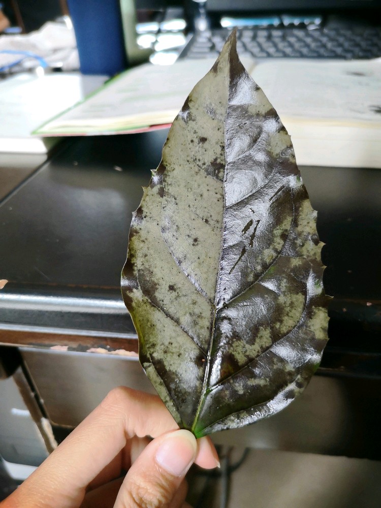 这是幸福树的叶片。前几天树才从温室里搬出来,这几天都是多雨 维持在10℃-20℃左右的天气。前几天喷了杀菌的,但是不知道药量是否适当。看一下能看出来是什么引起的吗。