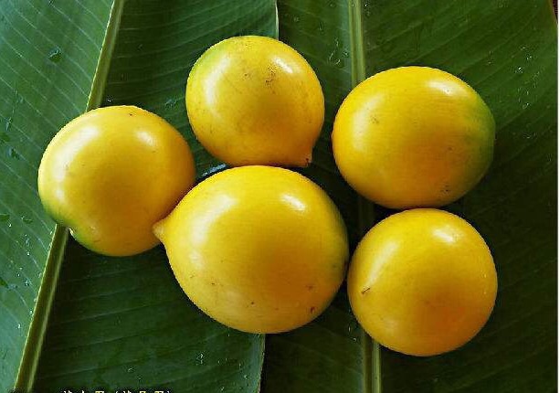 果实球形,未熟时绿色,成熟果黄绿色至橙黄色,光滑,皮薄,果肉橙黄色,富含淀粉,质地似蛋黄且有香气,含水量少,味略甜。其味道口感介乎于番薯和榴莲之间。种子通常1-2粒,近圆形或椭圆形。果实12月成熟,采收后需要后熟4-7天方可食用。