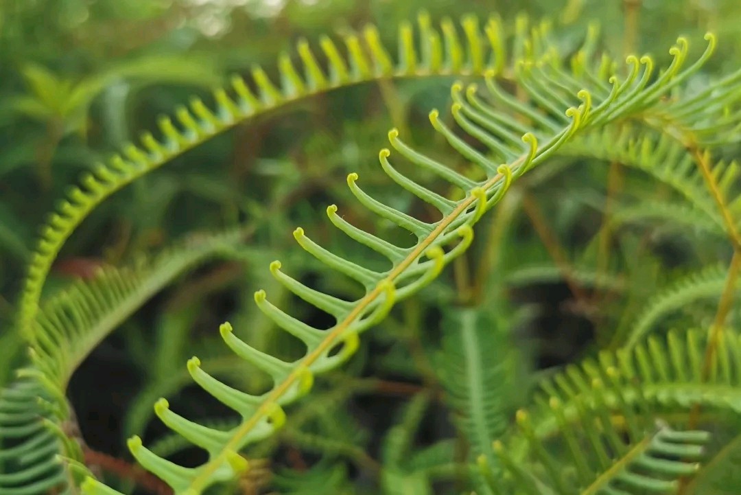 走在清泉古寺后山上,我发现了一大片绿,这便是本周小编要与大家分享的蕨类植物--芒萁。芒萁,拉丁学名Dicranopteri dichotoma(Thunb. ) Berhn,叶子的外形看起来就像两把背对背拥抱地梳子,可爱极了。此外,我还发现了其它蕨类植物,如铁芒萁、凤尾蕨、里白……而它们中的凤尾蕨生命力极其顽强,经常会看到长在墙壁石缝里,让人产生了浓浓的敬畏之情。