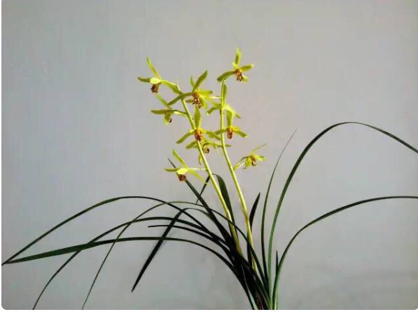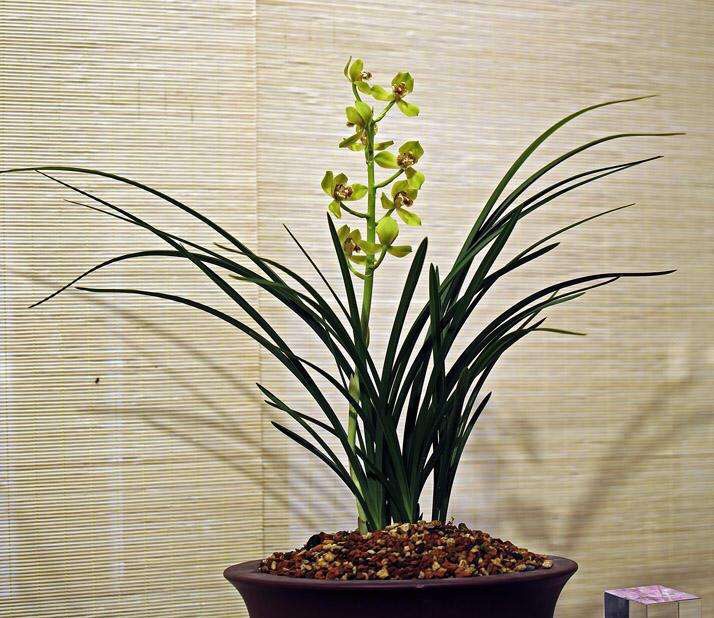 蕙兰(学名:Cymbidium faberi Rolfe):是兰科兰属的地生草本植物,假鳞茎不明显。叶5-8枚,带形,直立性强,叶脉透亮,边缘常有粗锯齿。花葶从叶丛基部最外面的叶腋抽出,总状花序具5-11朵或更多的花;花苞片线状披针形,最下面的1枚长于子房;花常为浅黄绿色,唇瓣有紫红色斑,有香气;花瓣与萼片相似,常略短而宽;唇瓣长圆状卵形,蕊柱稍向前弯曲,两侧有狭翅;花粉团4个,成2对,宽卵形。蒴果近狭椭圆形。花期3-5月。