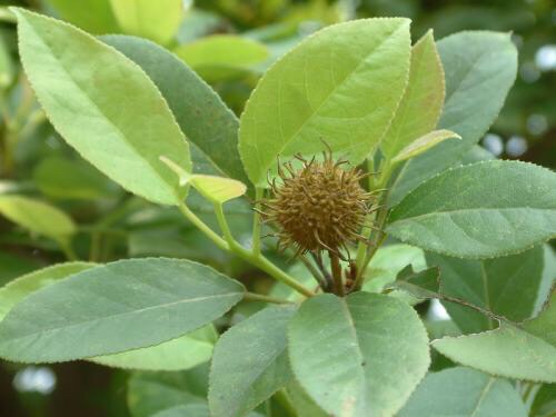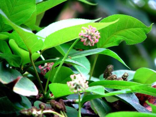 半枫荷(学名:Semiliquidambar cathayensis Hung T. Chang)是金缕梅科,半枫荷属常绿乔木,高可达17米,树皮灰色,芽体长卵形,老枝灰色,有皮孔。叶簇生于枝顶,革质,叶片卵状椭圆形,上面深绿色,下面浅绿色,掌状脉,雄花的短穗状花序常数个排成总状,花被全缺,雄蕊多数,花丝极短,雌花的头状花序单生,萼齿针形,花序柄无毛。头状果序宿存萼齿比花柱短。