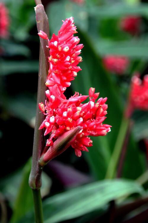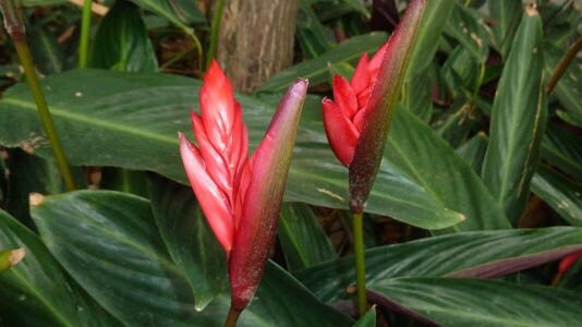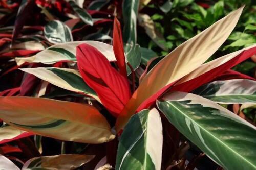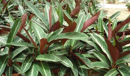 紫背竹芋(学名:Stromanthe sanguineaSond.):竹芋科,花竹芋属,多年生草本植物。株高可达80厘米,直立。叶片长卵形或披针形。它枝叶生长茂密、株形丰满,厚革质,叶面深绿色有光泽,中脉浅色,叶背血红色,形成鲜明的对比。穗状花序,苞片及萼鲜红色,花瓣白色。背部呈紫红色。
