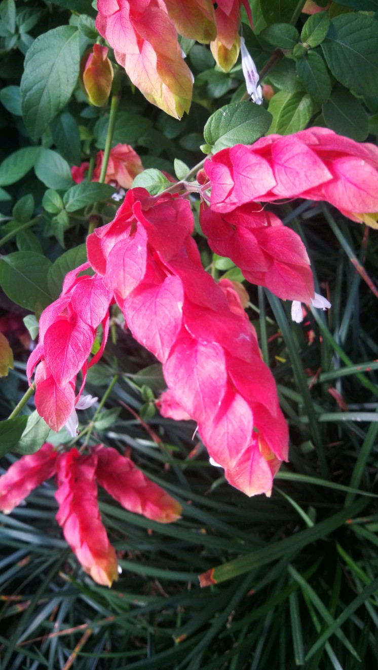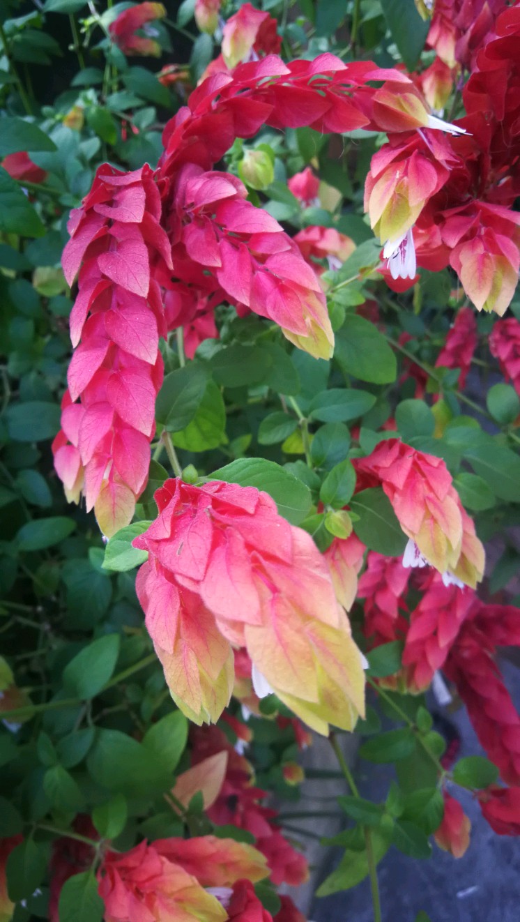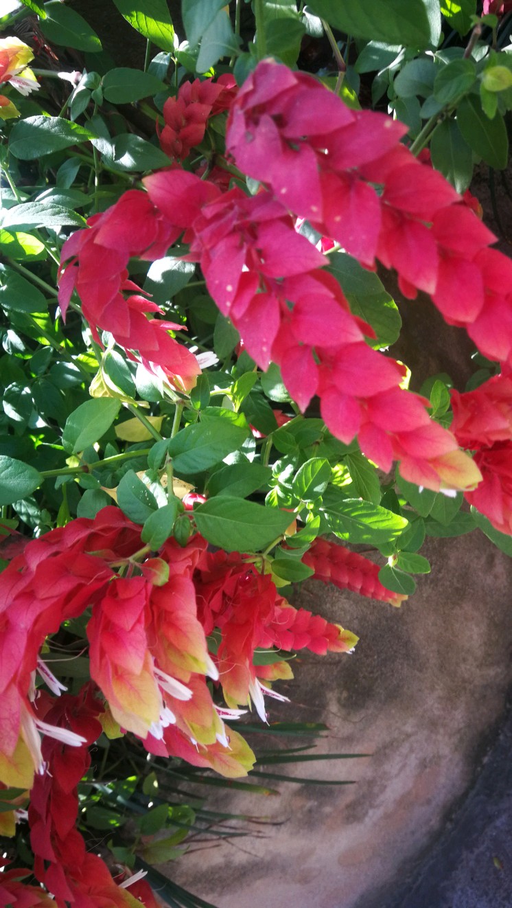 虾衣花(Calliaspidia guttata (Brandegee) Bremek. )是爵床科、麒麟吐珠属的多年生草本或常绿亚灌木。株高1-2米,茎细弱,多分枝,全株被毛。叶卵形或椭圆形,全缘。穗状花序顶生、下垂,长6-9厘米,具棕、红、黄绿或黄色宿存苞片,花白色、唇形,花形似虾,上唇全缘或梢2裂,下唇3浅裂,基部有3行紫色斑点。