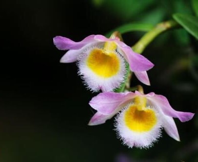 美花石斛(学名:Dendrobium loddigesii Rolfe):茎柔弱,常下垂,细圆柱形,有时分枝,具多节;节间长1.5-2厘米,干后金黄色。叶纸质,二列,互生于整个茎上,舌形,长圆状披针形或稍斜长圆形。花白色或紫红色,每束1-2朵侧生于具叶的老茎上部;花瓣椭圆形,与中萼片等长,宽8-9毫米,先端稍钝,全缘,具3-5条脉;唇瓣近圆形,直径1.7-2厘米,上面中央金黄色,周边淡紫红色,稍凹的,边缘具短流苏,两面密布短柔毛。