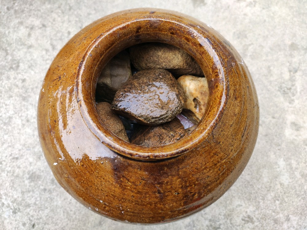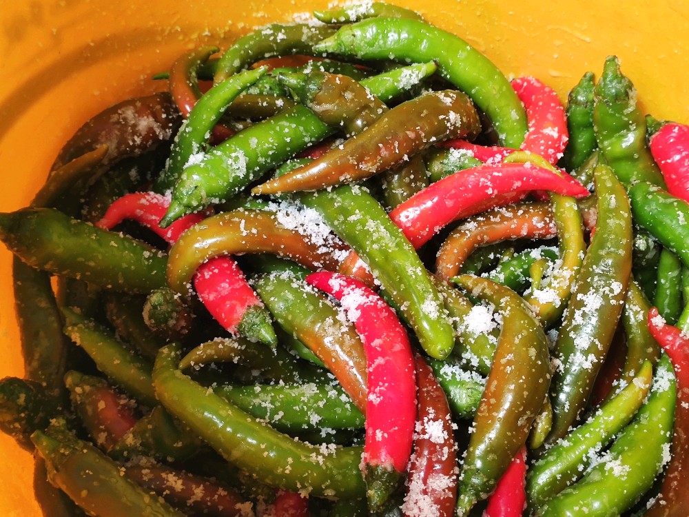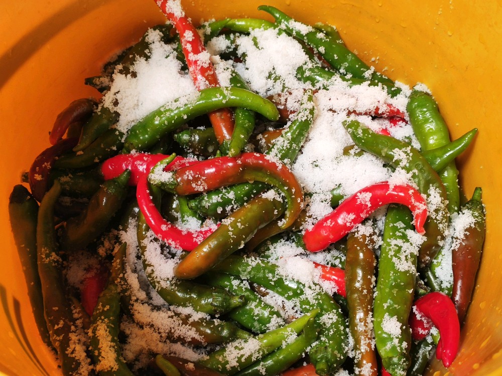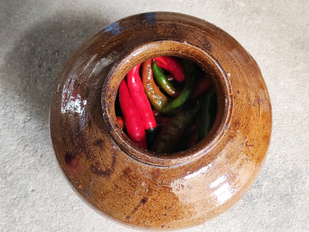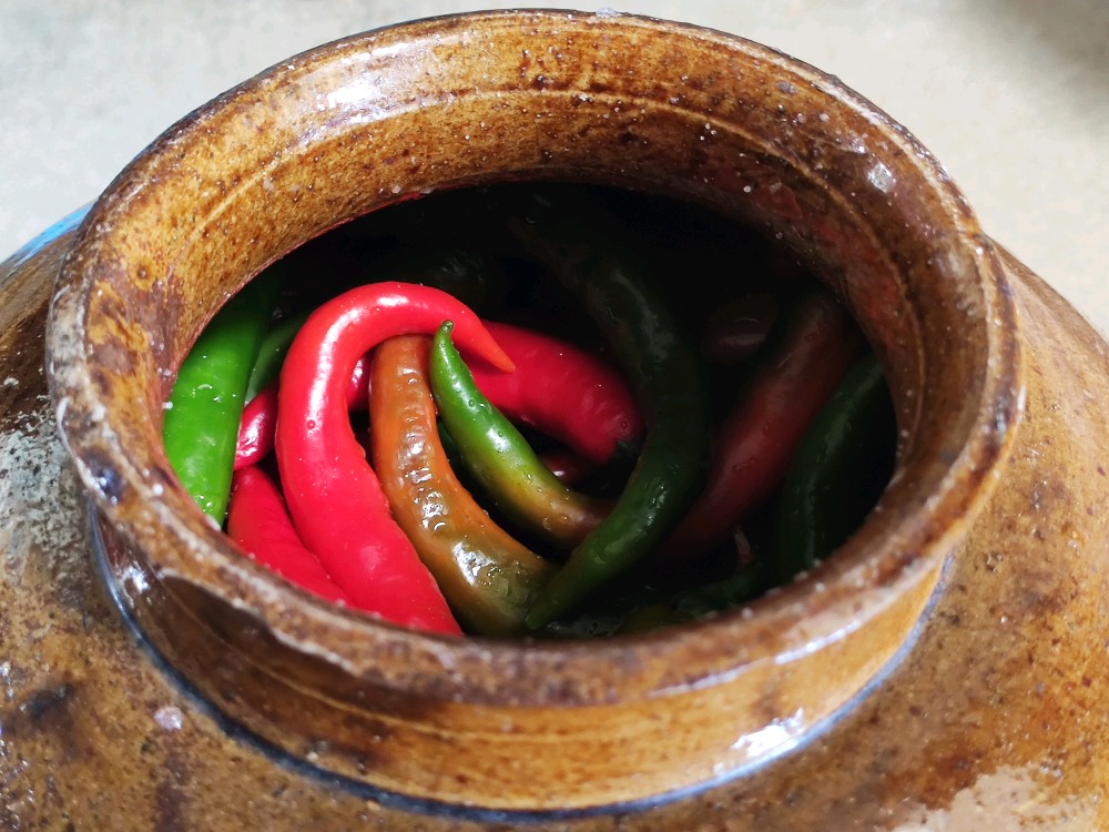 第二天装坛,辣椒压实,塑料袋铺平放置辣椒上,再压上石头。水+适量醋倒入坛内,水漫过辣椒即可。再把坛子放在阳光照射不到的地方,等上个半月左右就可以吃上爽口开胃的腌辣椒了。