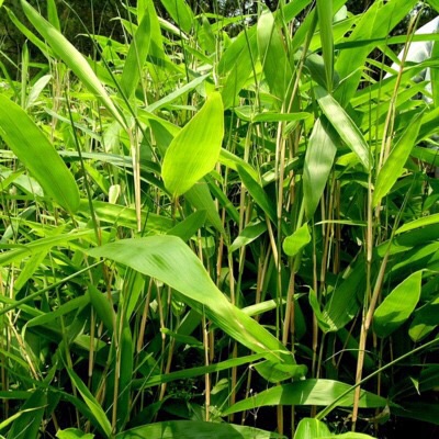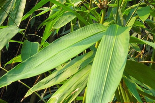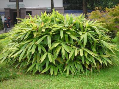 箬竹(学名:Indocalamus tessellatus (Munro) Keng f.):禾本科、箬竹属植物,竿高可达2米,最大直径7.5毫米;一般为绿色,竿下部者较窄,竿上部者稍宽,小枝2-4叶;叶鞘紧密抱竿,无叶耳;叶截形;叶片在成长植株上稍下弯,宽披针形或长圆状披针形,先端长尖,基部楔形,下表面灰绿色,密被贴伏的短柔毛或无毛,叶缘生有细锯齿。未成熟者圆锥花序,小穗绿色带紫,花药黄色;子房和鳞被未见。4-5月笋期,6-7月开花。