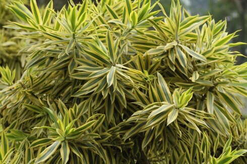 黄边百合竹,为百合科、龙血树属常绿灌木。株高可达9米。能自行分枝,茎干较纤细,长高后茎干易弯斜。叶剑状披针形,长10- 16厘米,宽2-3厘米,无柄,丛生于茎端,革质,叶色浓绿,富有光泽。叶与富贵竹相似,但叶片向下弯曲,而且节间较短,使叶片显得十分密集。