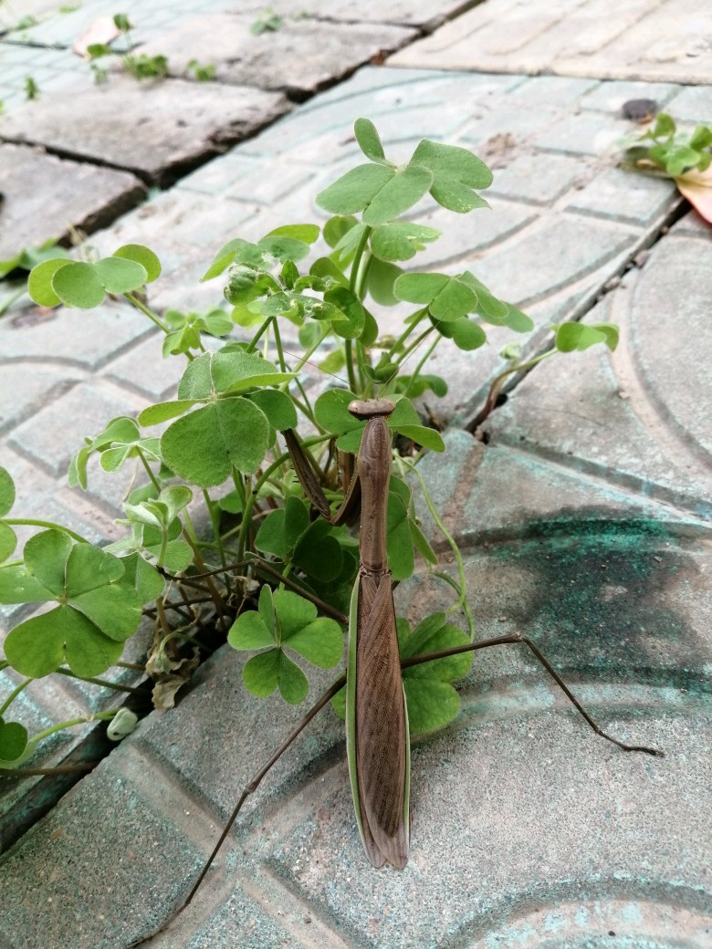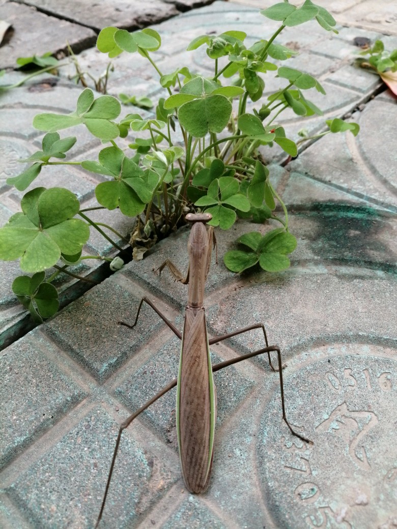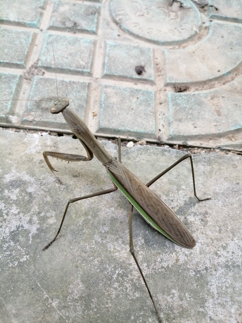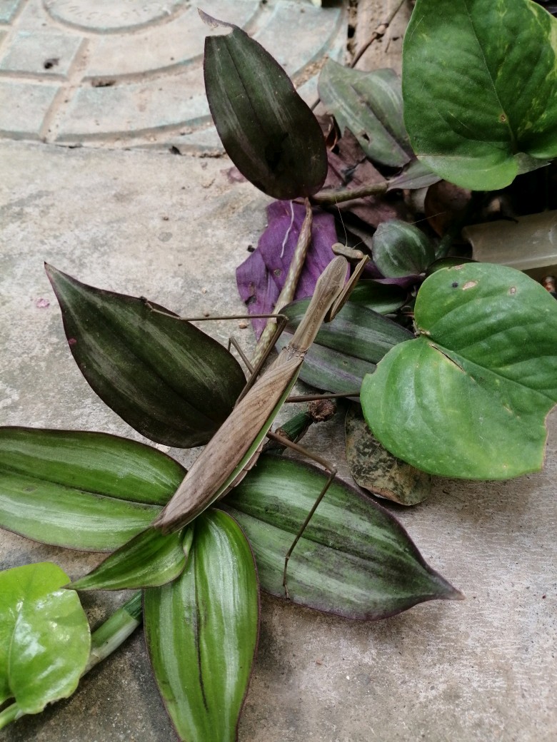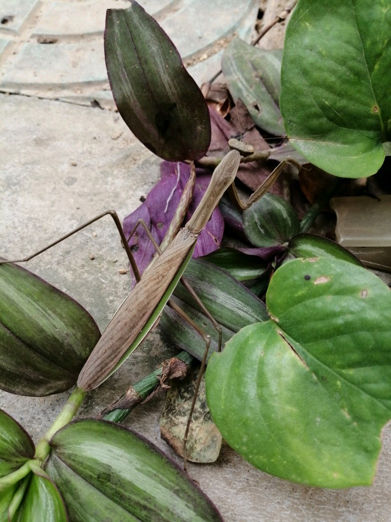 今天无意间发现了一只灰色的螳螂,它穿着褐色的衣服,背上还有暗色的条纹,两边露出绿色的翅膀。常见的都是绿螳螂,我以为这个是不是变老的绿螳螂,一查原来它叫中华大刀螂,绿色的叫宽腹螳螂。体色因种类和栖息地而定,这家伙如果趴在枯草地或落叶中,真的很难发现呢。