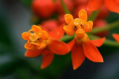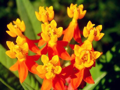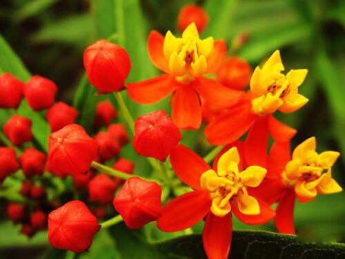 马利筋(Asclepias curassavica L.),又名莲生桂子花、芳草花、水羊角,萝藦科(Asclepiadaceae)宿根多年生草本,灌木状,高达60-120cm。全株含白色体液。叶对生,披针形,全绿。伞形花序着花10余朵;花朵小巧玲珑,花冠朱红色,5深裂;副花冠金黄色,带有角状突起,矗立呈兜状,盛开时轻盈明媚,多姿多彩。花期春至夏季。花后能结果,蓇葖果鹤嘴形,成熟后会裂开,内有多粒棕黑色种子,种子顶端具白色绢质种毛,好像降落伞,随风飘飞,到处播种。