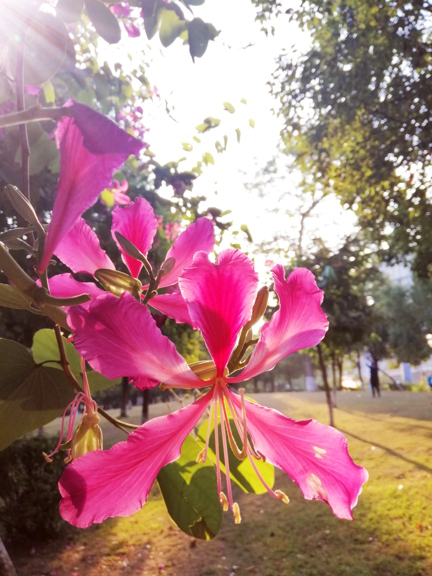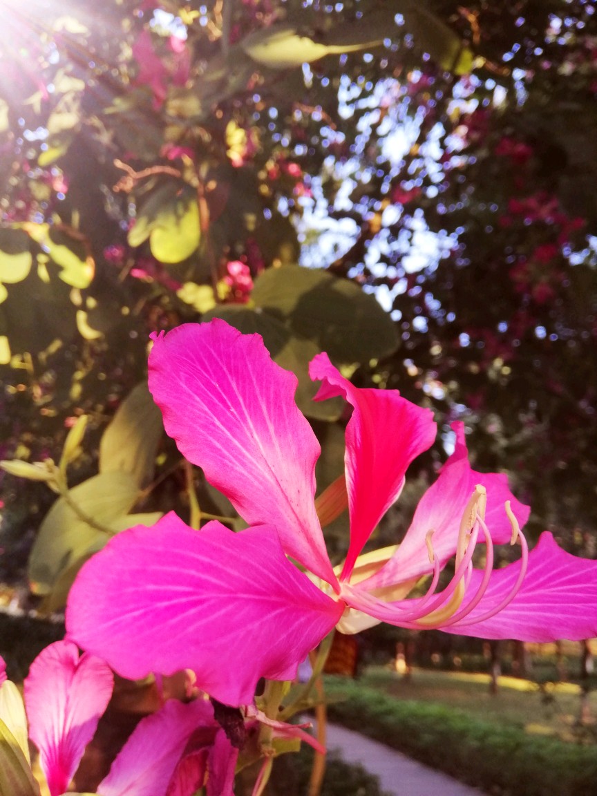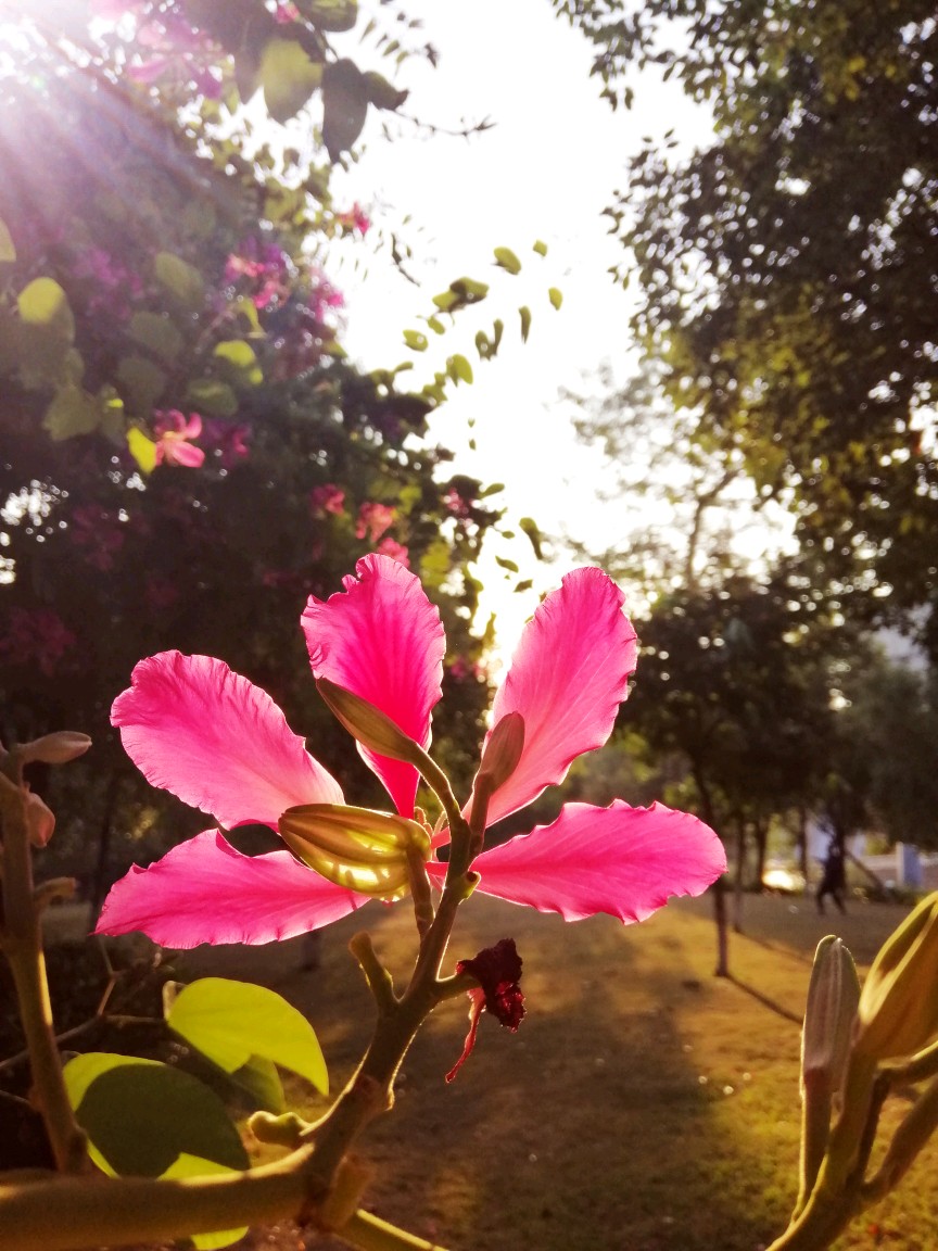 今天是假日,一早起来去梅花山上闲逛。山上的红花羊蹄甲已在晨曦中舒展绽放。