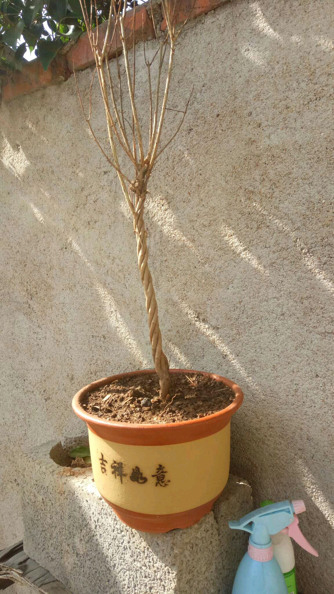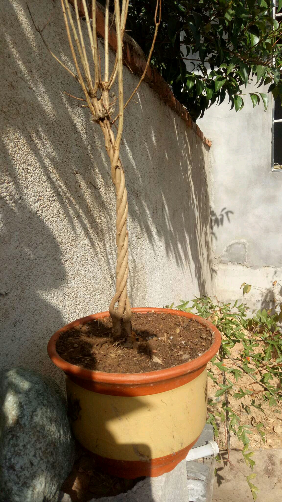 好看吧?编麻花辫的石榴苗,去年开始弄,总共弄了40棵,一颗已经上盆了,看看效果