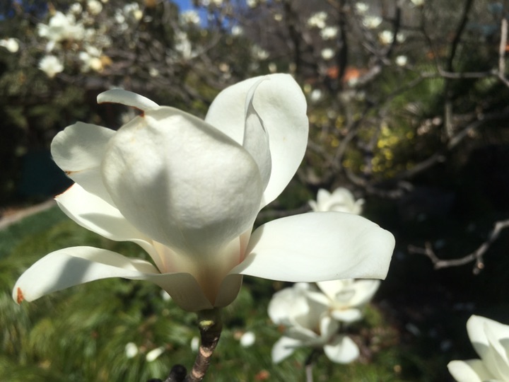 玉兰(Magnolia denudata Desr.),为木兰目、木兰科、木兰属落叶乔木,别名白玉兰、望春、玉兰花。 原产于中国中部各省,现北京及黄河流域以南均有栽培。木兰科玉兰亚属,落叶乔木。花白色到淡紫红色,大型、芳香,花冠杯状,花先开放,叶子后长,花期10天左右。中国著名的花木,南方早春重要的观花树木。上海市市花。玉兰花外形极像莲花,盛开时,花瓣展向四方,使庭院青白片片,白光耀眼,具有很高的观赏价值;为美化庭院之理想花型。