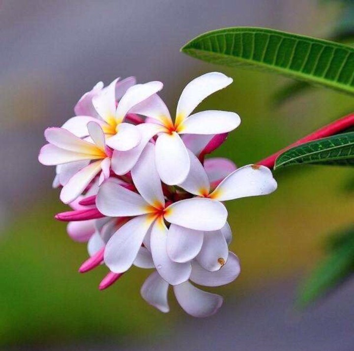 鸡蛋花(Plumeria rubra L. cv. Acutifolia),别名缅栀子、蛋黄花、印度素馨、大季花,夹竹桃科、鸡蛋花属落叶灌木或小乔木。小枝肥厚多肉。叶大,厚纸质,多聚生于枝顶,叶脉在近叶缘处连成一边脉。花数朵聚生于枝顶,花冠筒状,径约5~6cm,5裂。外面乳白色,中心鲜黄色,极芳香。花期5~10月。 鸡蛋花夏季开花,清香优雅。落叶后,光秃的树干弯曲自然,其状甚美。适合于庭院、草地中栽植,也可盆栽,可入药。原产美洲,中国已引种栽培。