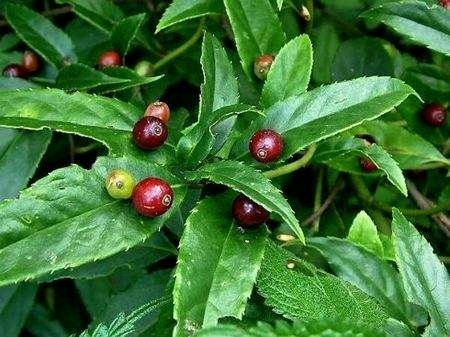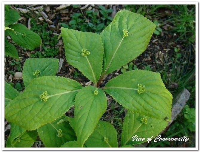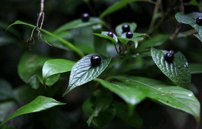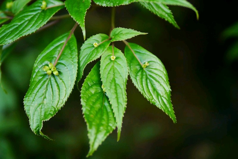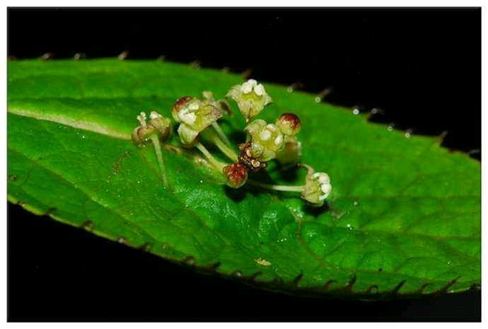 有一种长长的叶子,带有细小尖锐的锯齿。叶片中间的主脉盛开着其貌不扬的花蕊。它没有芳香,小花点点一小丛,黄绿色。中文学名:青荚叶。(拉丁文学名:Helwingiajaoonica(Thunb)Dietr)初夏开花,谢了有紫粒核果,(黑紫色)圆圆的小球。故名:“叶上珠”。