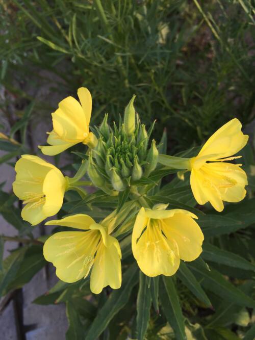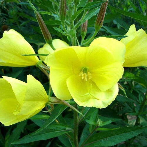 黄花月见草(Oenothera glazioviana Mich.) 柳叶菜科、月见草属直立二年生至多年生草本,具粗大主根;茎高70-150厘米,粗6-20毫米,不分枝或分枝,常密被曲柔毛与疏生伸展长毛(毛基红色疱状),在茎枝上部常密混生短腺毛。基生叶莲座状,倒披针形,先端锐尖或稍钝,基部渐狭并下延为翅,边缘自下向上有远离的浅波状齿,白色或红色,上部深绿色至亮绿色,两面被曲柔毛与长毛;茎生叶螺旋状互生,狭椭圆形至披针形,自下向上变小,。种子棱形,褐色,具棱角,各面具不整齐洼点,有约一半败育。花期5-10月,果期8-12月。