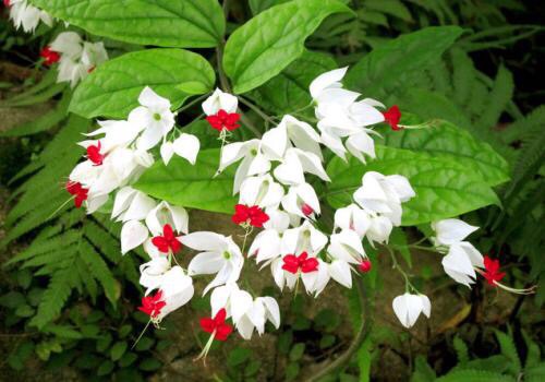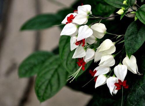 龙吐珠(学名:Clerodendrum thomsonae Balf.):马鞭草科灌木,幼枝四棱形,被黄褐色短绒毛,老时无毛。叶片纸质,狭卵形或卵状长圆形,顶端渐尖,基部近圆形,全缘;聚伞花序腋生或假顶生,二歧分枝;苞片狭披针形;花萼白色,基部合生,中部膨大,裂片三角状卵形,顶端渐尖;花冠深红色,外被细腺毛,裂片椭圆形;雄蕊4,与花柱同伸出花冠外;柱头2浅裂。核果近球形,外果皮光亮,棕黑色;宿存萼不增大,红紫色。花期3-5月。